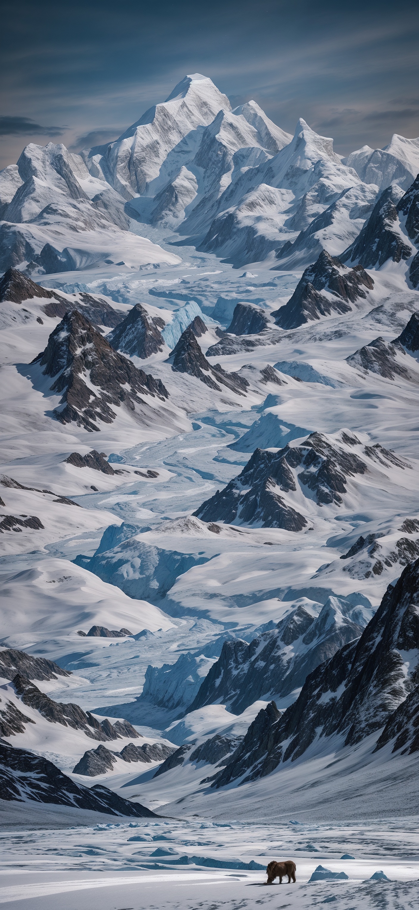 Download this breathtaking wallpaper featuring a majestic snow-capped mountain range with a lone lion wandering through the icy landscape. Perfect for desktops, tablets, and smartphones. Free to use.