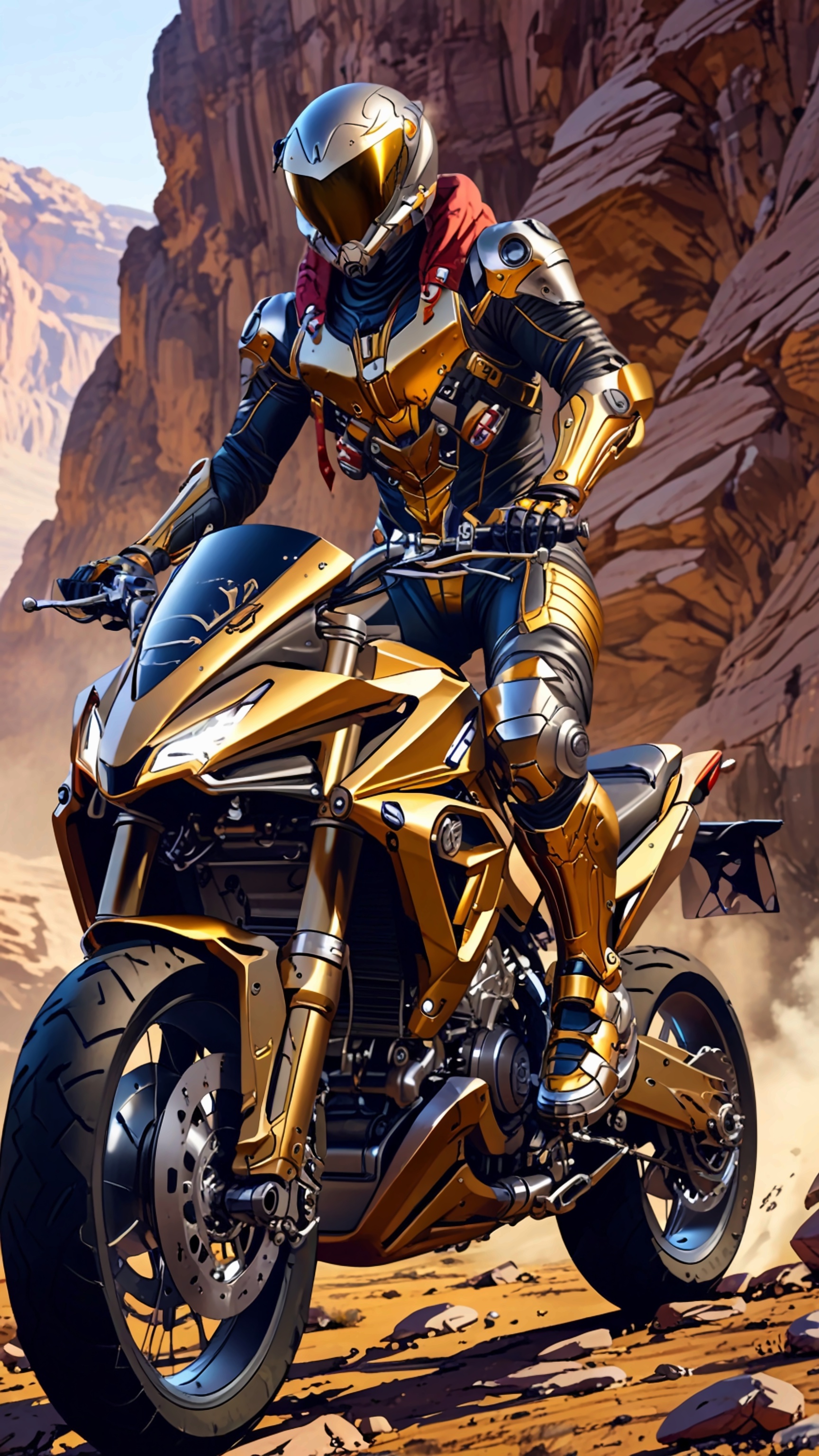 A futuristic space adventurer in a rugged metallic suit with gold accents rides a high-tech motorcycle across a rocky alien landscape, capturing the spirit of exploration.