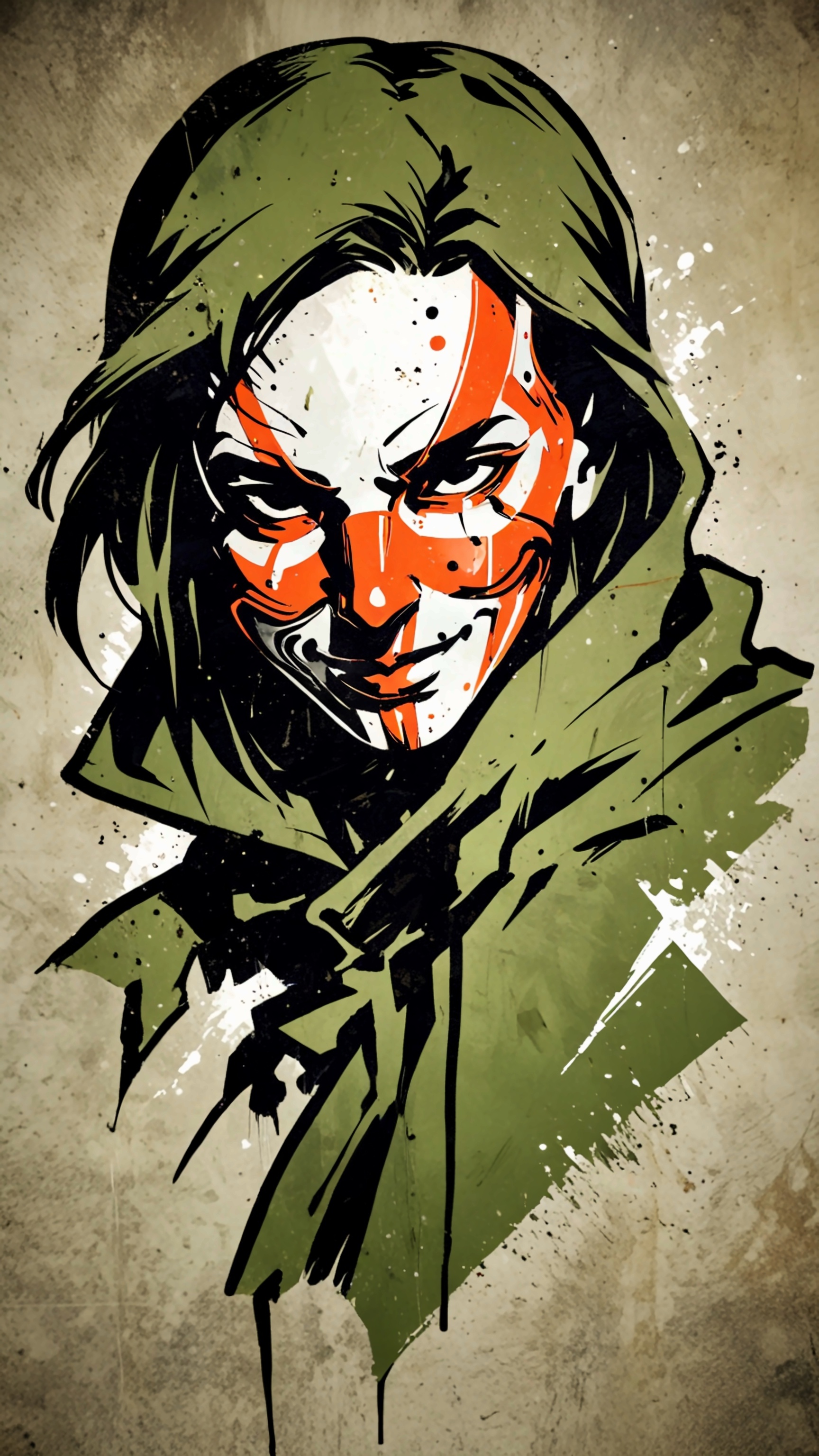A gritty stencil art depiction of a masked revolutionary with sharp lines and contrasting army green and white hues, evoking the rebellious spirit of graffiti culture.