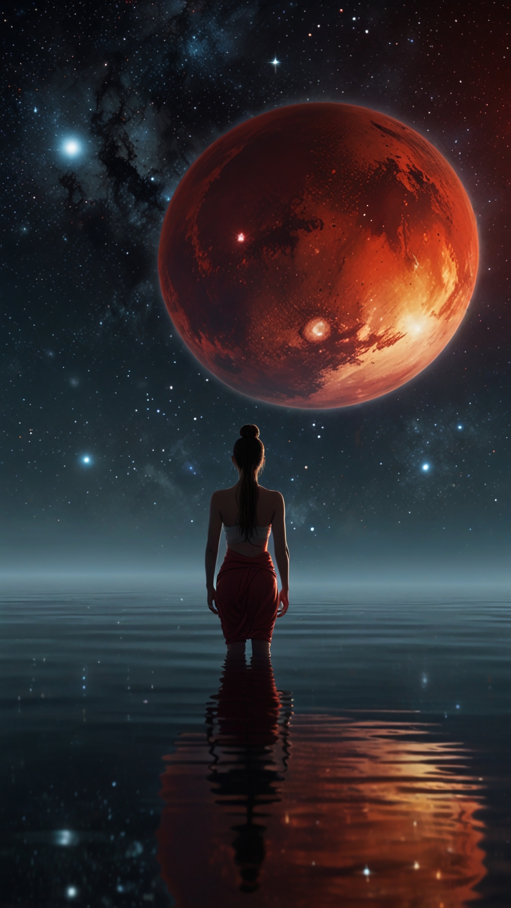Immerse yourself in the cosmos with this stunning wallpaper featuring a silhouetted figure standing in calm waters, gazing at a majestic red planet surrounded by a starry sky, evoking a sense of wonder and exploration.