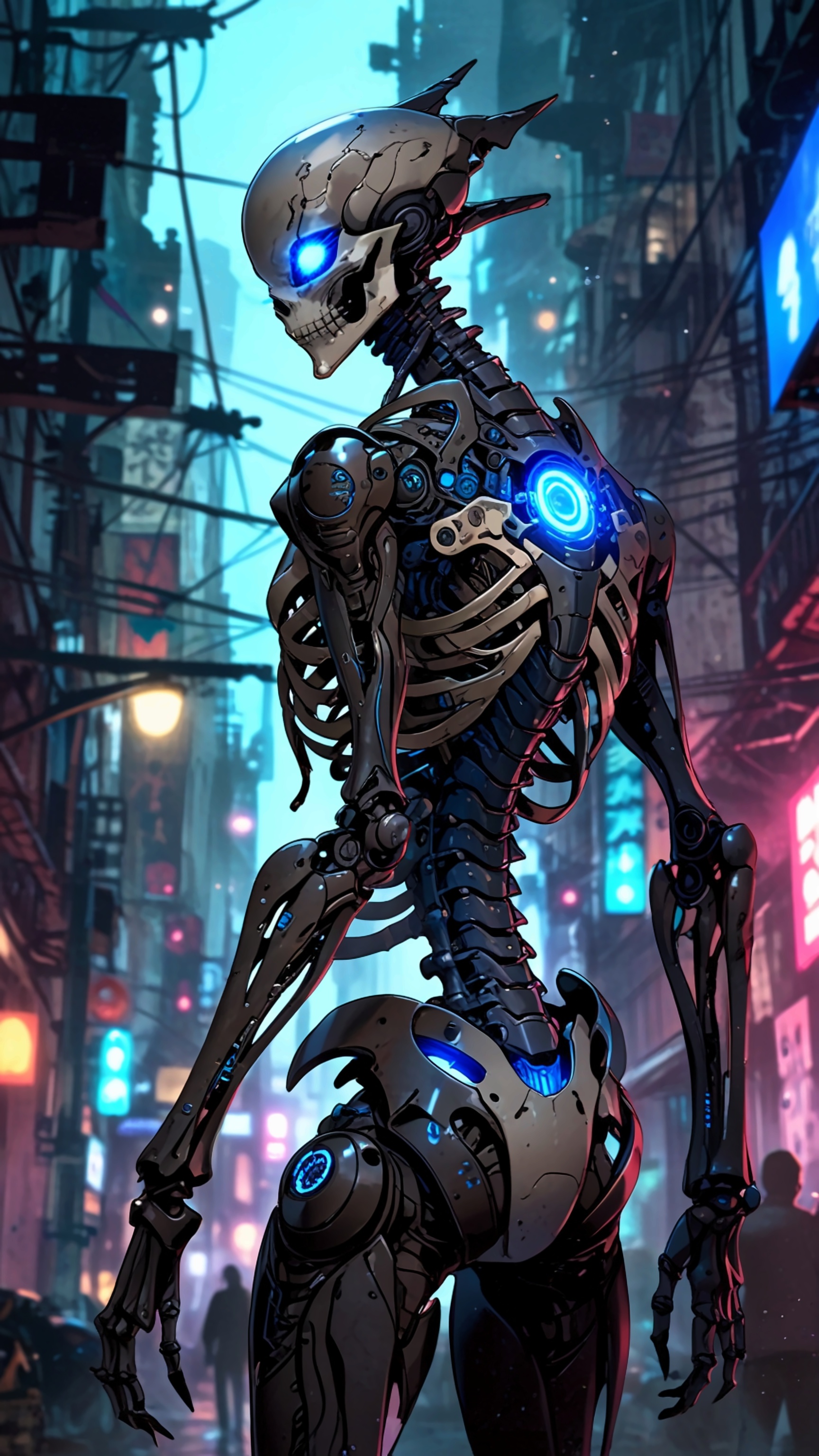 Step into a cyberpunk world with this striking wallpaper featuring a futuristic robotic skeleton illuminated by neon lights in a bustling cityscape, showcasing intricate details and a captivating design.