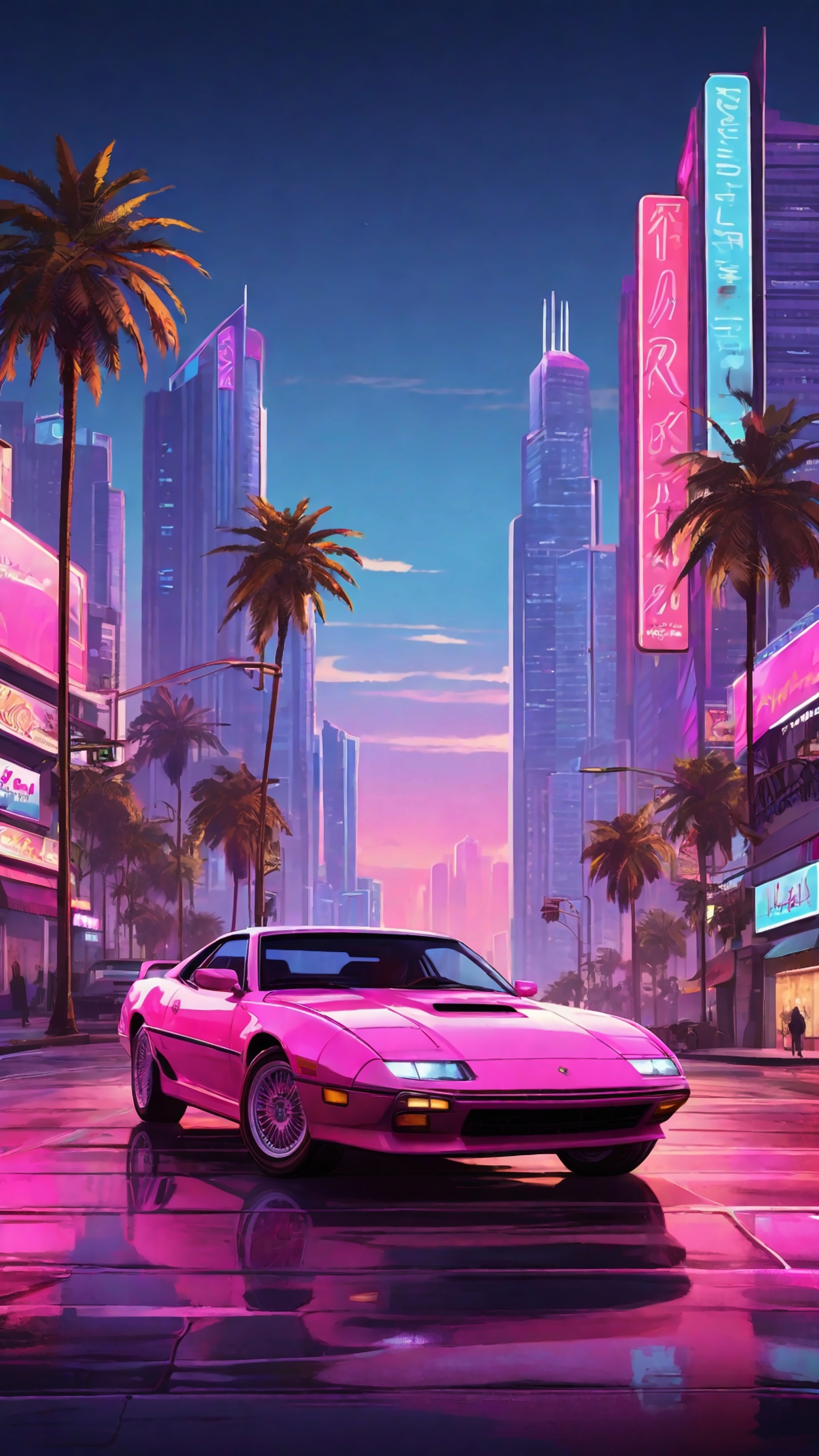 Brighten your space with this stunning wallpaper featuring a vibrant pink retro car parked in a neon-lit cityscape, surrounded by palm trees and glowing signs, capturing the essence of a futuristic urban paradise.