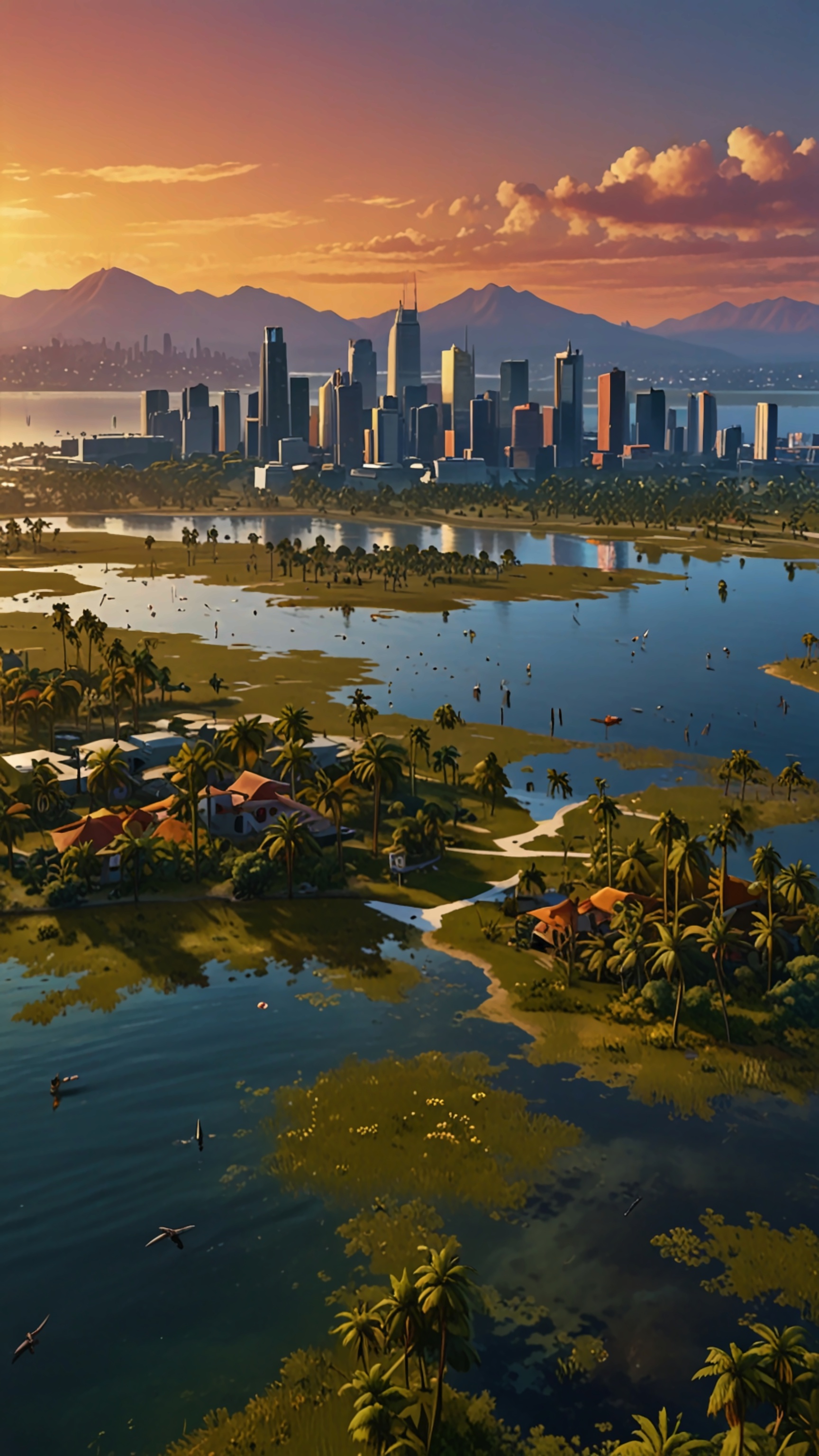 Experience the beauty of urban nature with this breathtaking wallpaper showcasing a vibrant sunset over a modern city skyline, surrounded by lush wetlands and palm trees, capturing the harmony of nature and architecture.