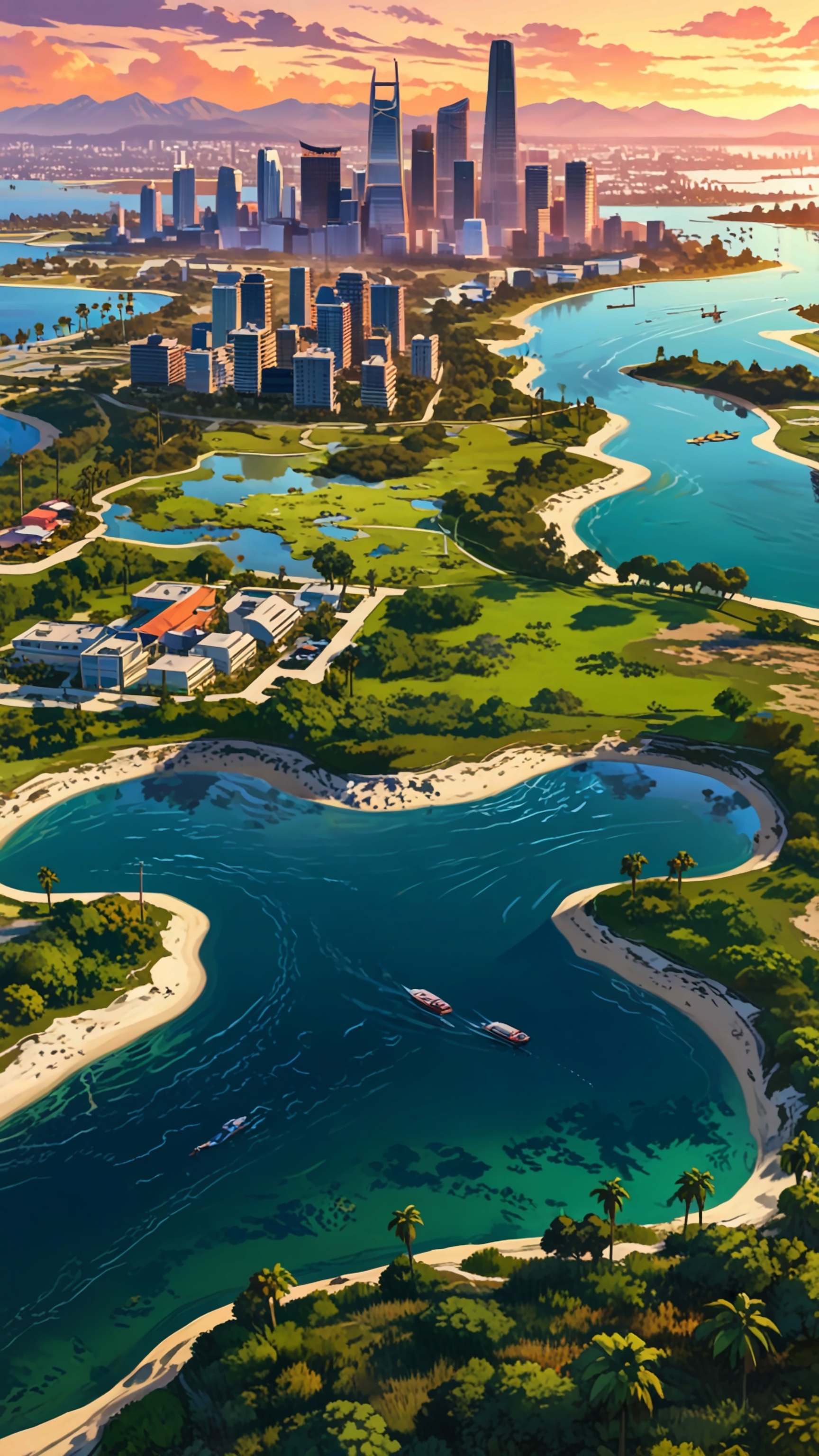 Discover the beauty of urban life with this breathtaking aerial wallpaper featuring a modern city skyline at sunset, surrounded by lush greenery and winding waterways.