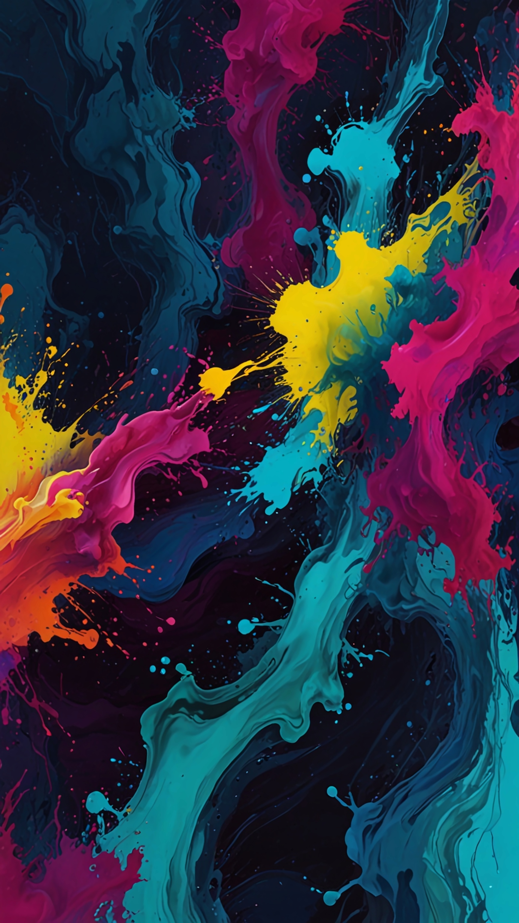 Brighten your space with this stunning wallpaper featuring vibrant abstract swirls and splashes of paint in bold colors like yellow, pink, and blue against a dark background.