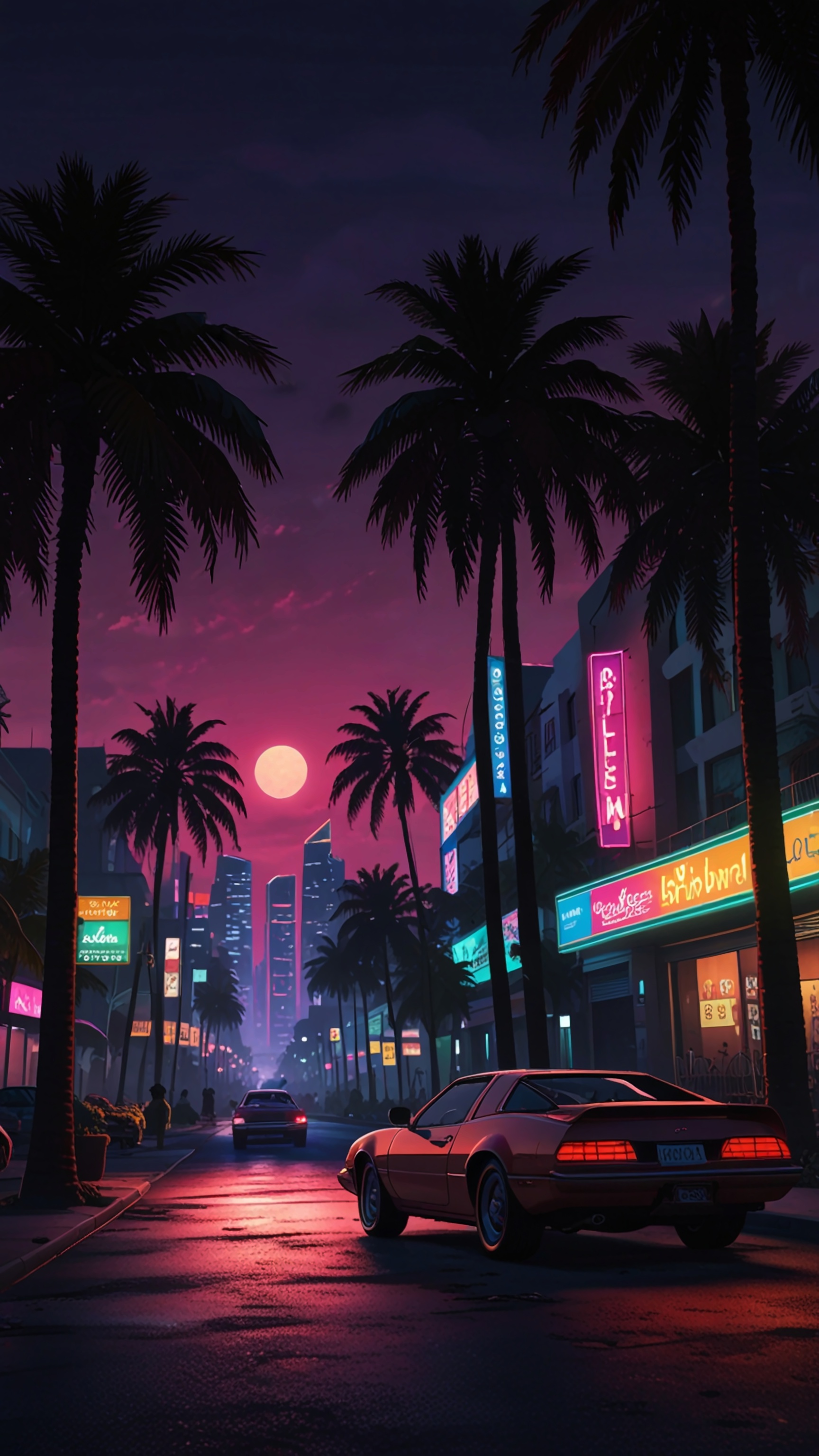 Download WallpaperRetro Cityscape at Dusk with Palm Trees and Neon Lights Wallpaper