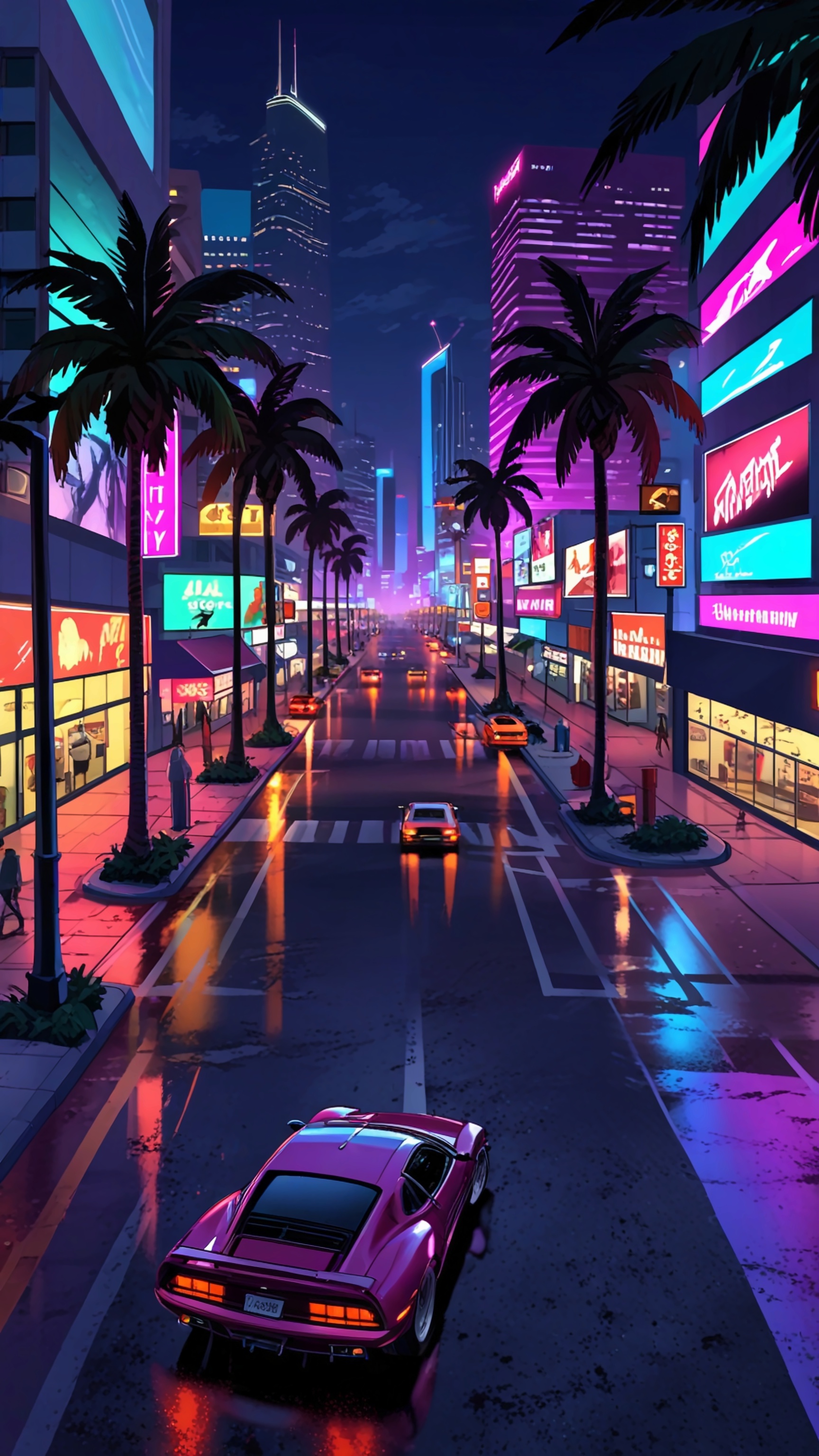 Immerse yourself in this vibrant wallpaper featuring a neon cityscape illuminated by colorful lights, showcasing a sleek pink sports car cruising through the lively streets.