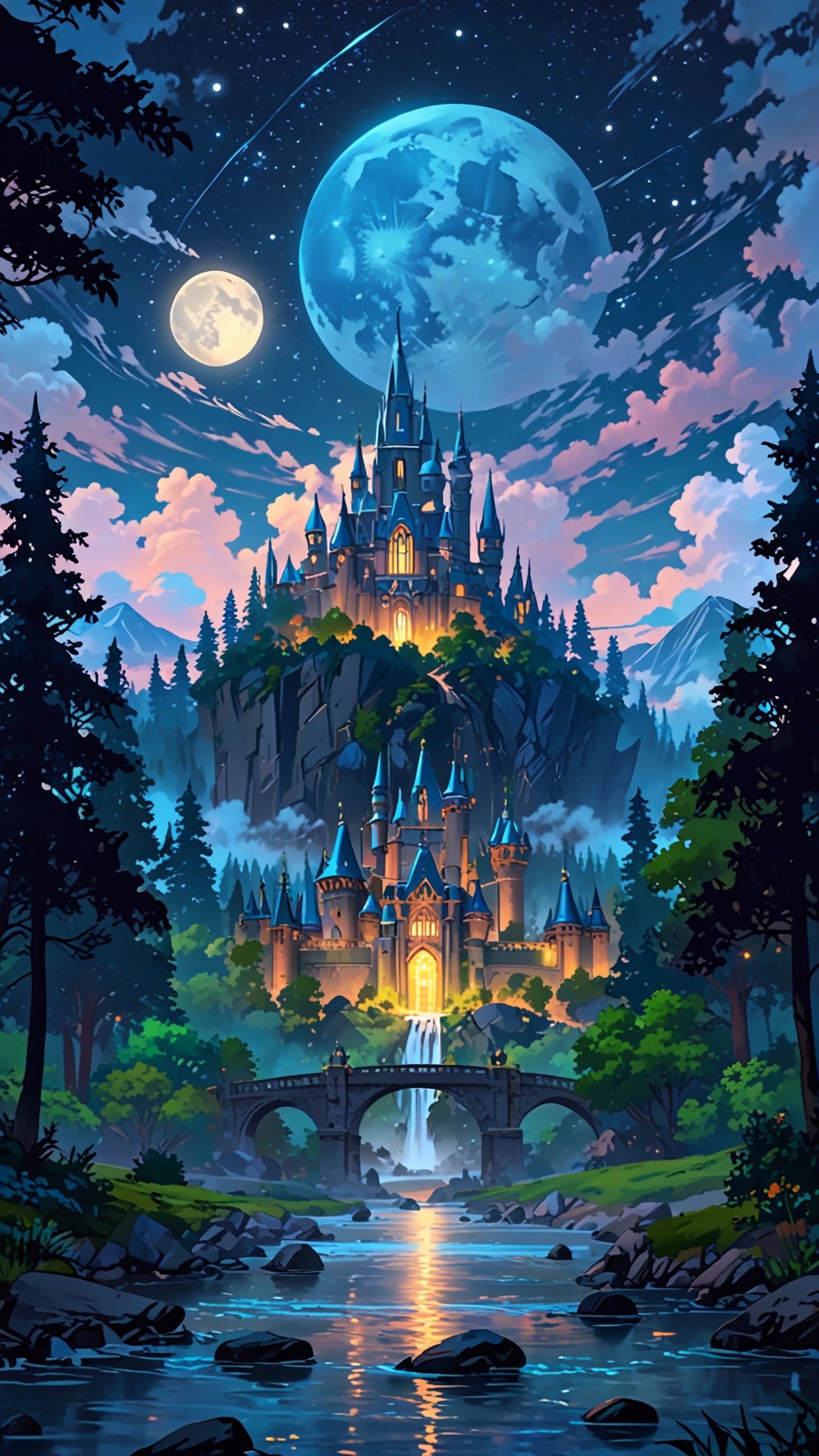A majestic floating castle with gothic spires and greenery, suspended above a glowing river, surrounded by waterfalls, forests, and misty mountains under a golden sky.