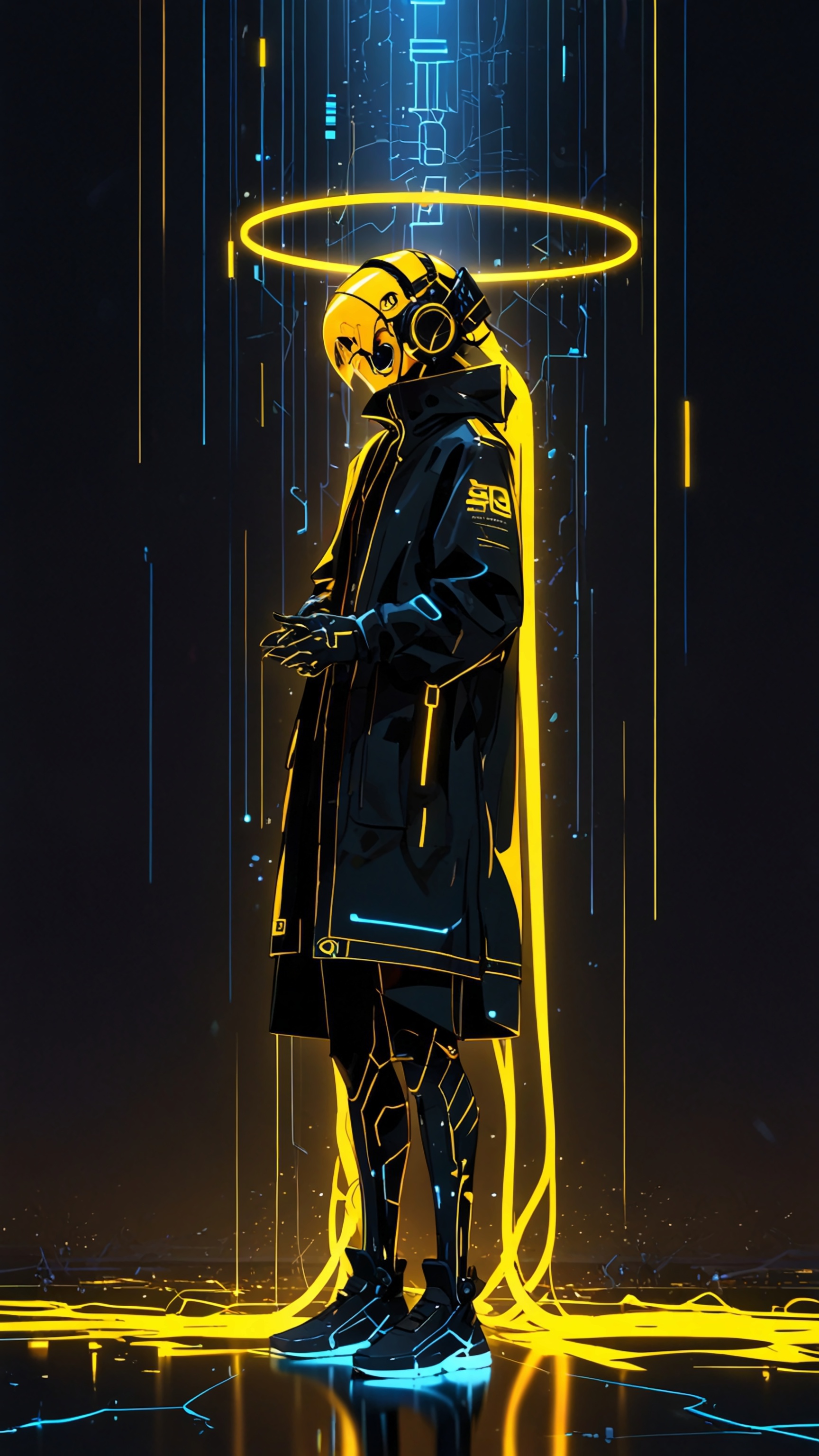 A cybernetic figure in sleek black armor with glowing yellow circuits sits in thought, surrounded by cascading golden data streams. Reflective and futuristic.