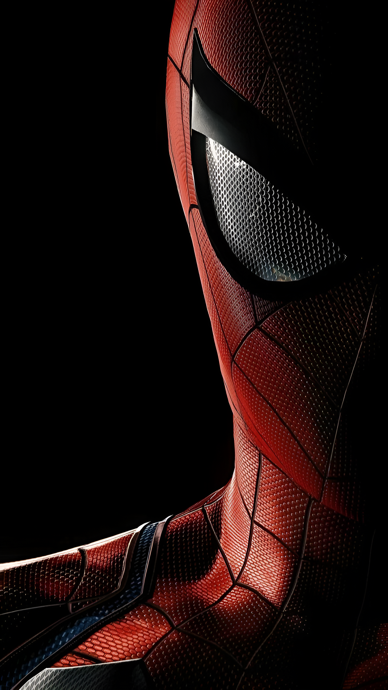 Download this dramatic wallpaper featuring a close-up of Spider-Man partially illuminated in the shadows. The detailed texture of the suit and the intense expression create a powerful and iconic image, perfect for desktops, tablets, and smartphones. Free to use.