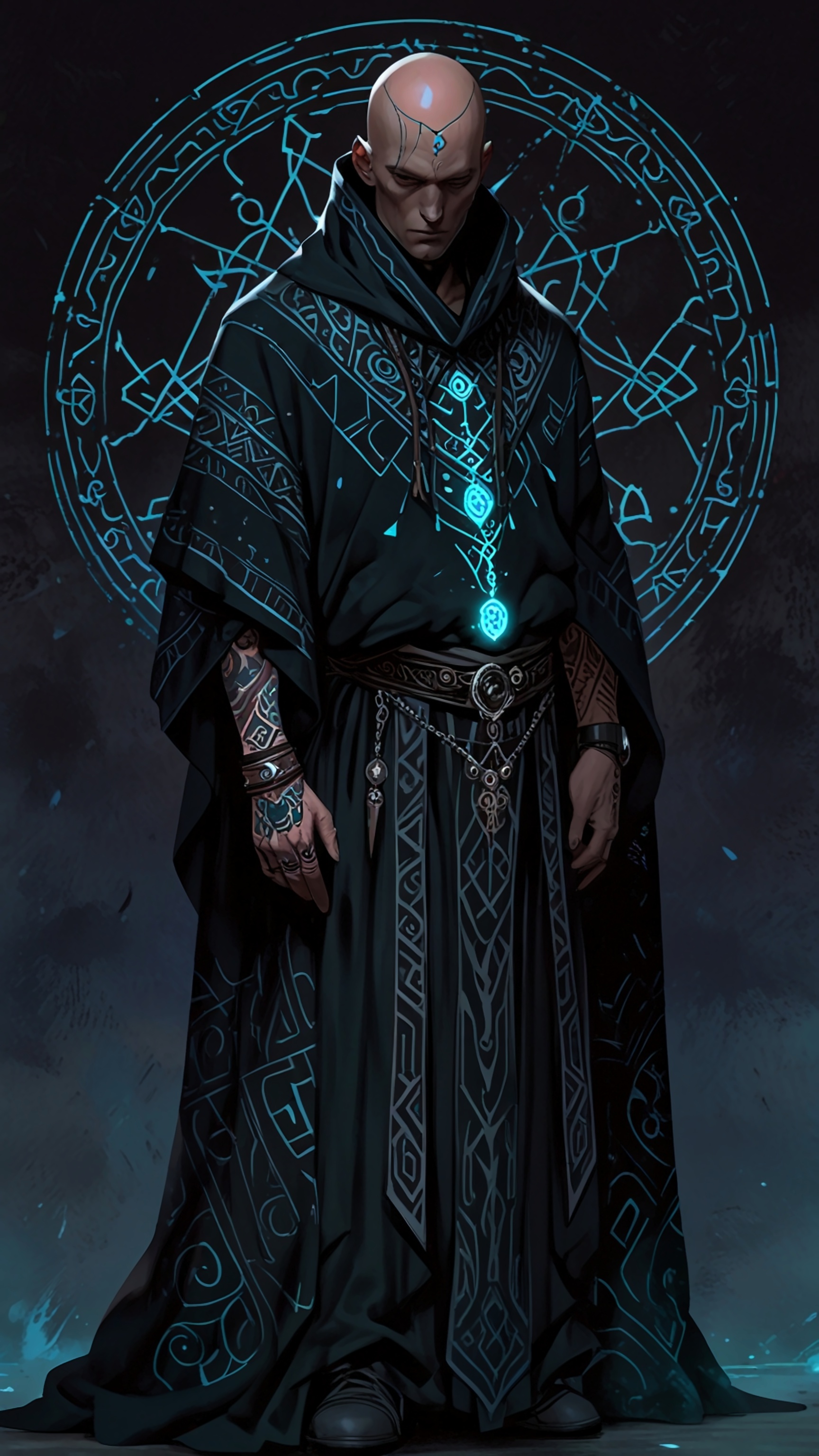 A cloaked figure with glowing runic tattoos, embodying ancient knowledge, standing against a shadowy, ethereal background that amplifies its enigmatic aura.