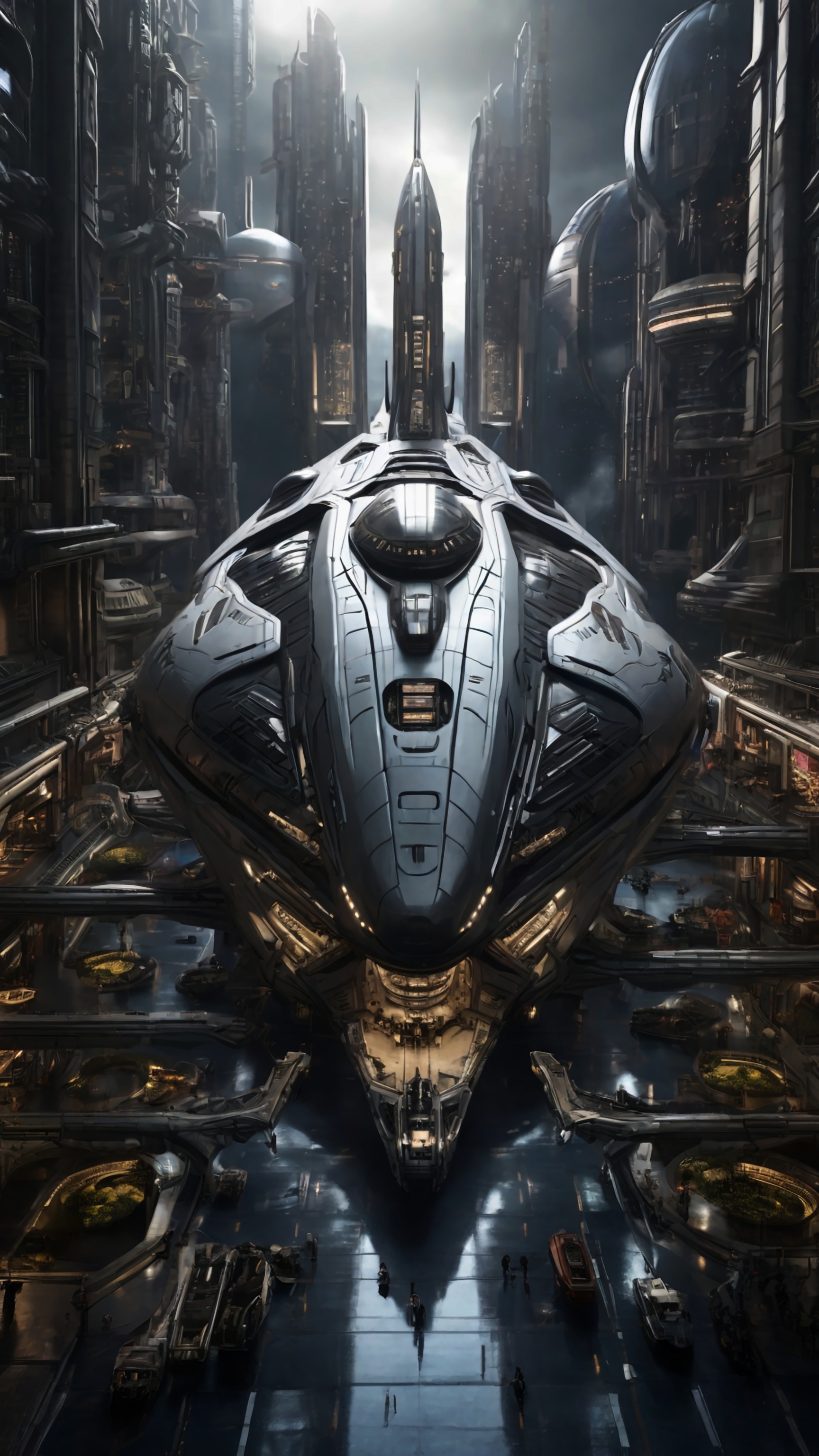 Download WallpaperColossal Spaceship Docked in Futuristic Megacity