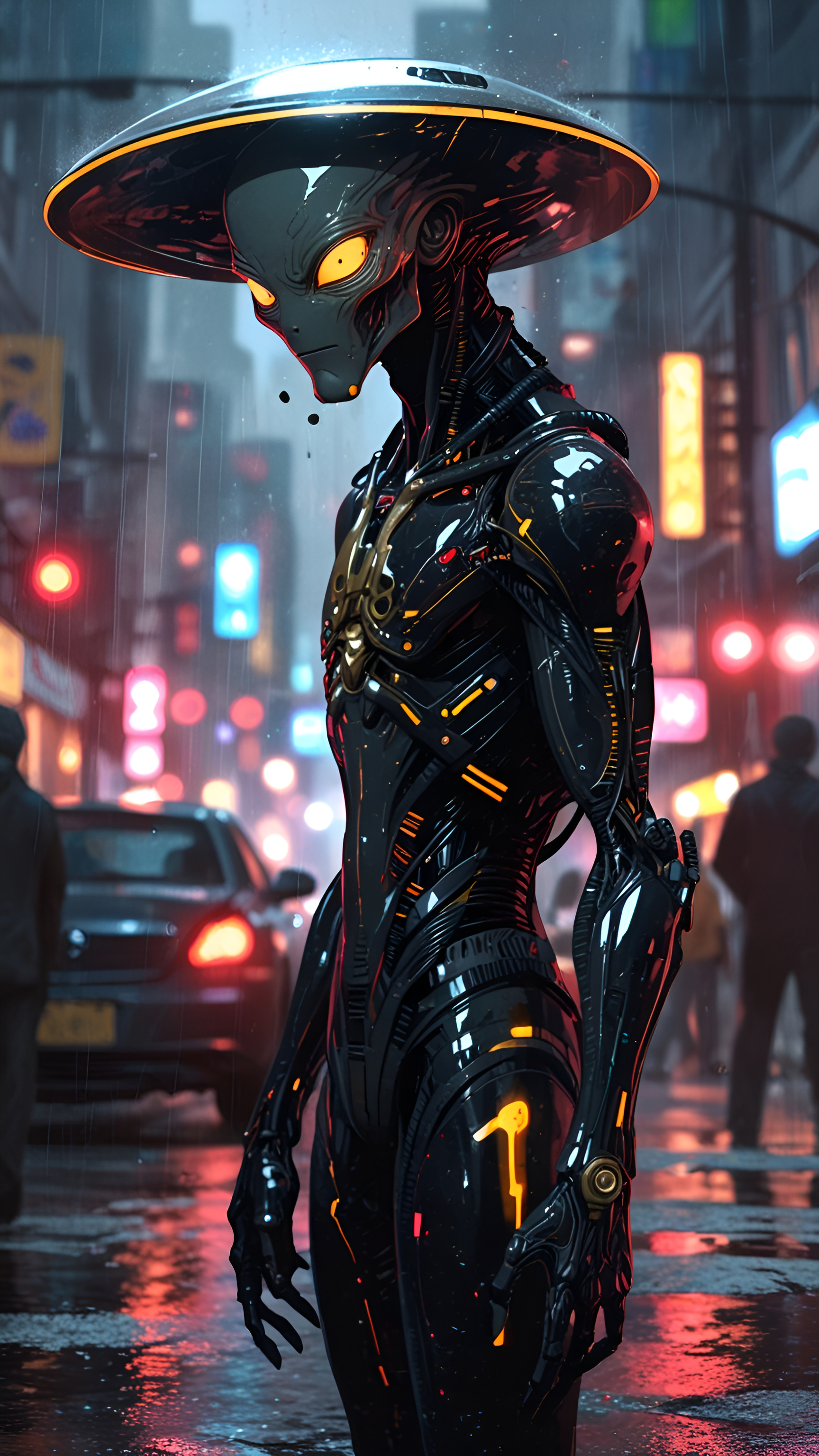 Immerse yourself in a cyberpunk world with this striking wallpaper featuring a futuristic robotic character standing in a vibrant, neon-lit cityscape. The character's sleek, high-tech design is accentuated by glowing orange and yellow lights, contrasting sharply with the dark, rainy urban background. The bustling city lights and reflections on the wet streets create a dynamic and immersive atmosphere, perfect for fans of sci-fi and cyberpunk aesthetics. This wallpaper is ideal for adding a touch of futuristic flair to your digital devices, inspiring thoughts of advanced technology and dystopian adventures.