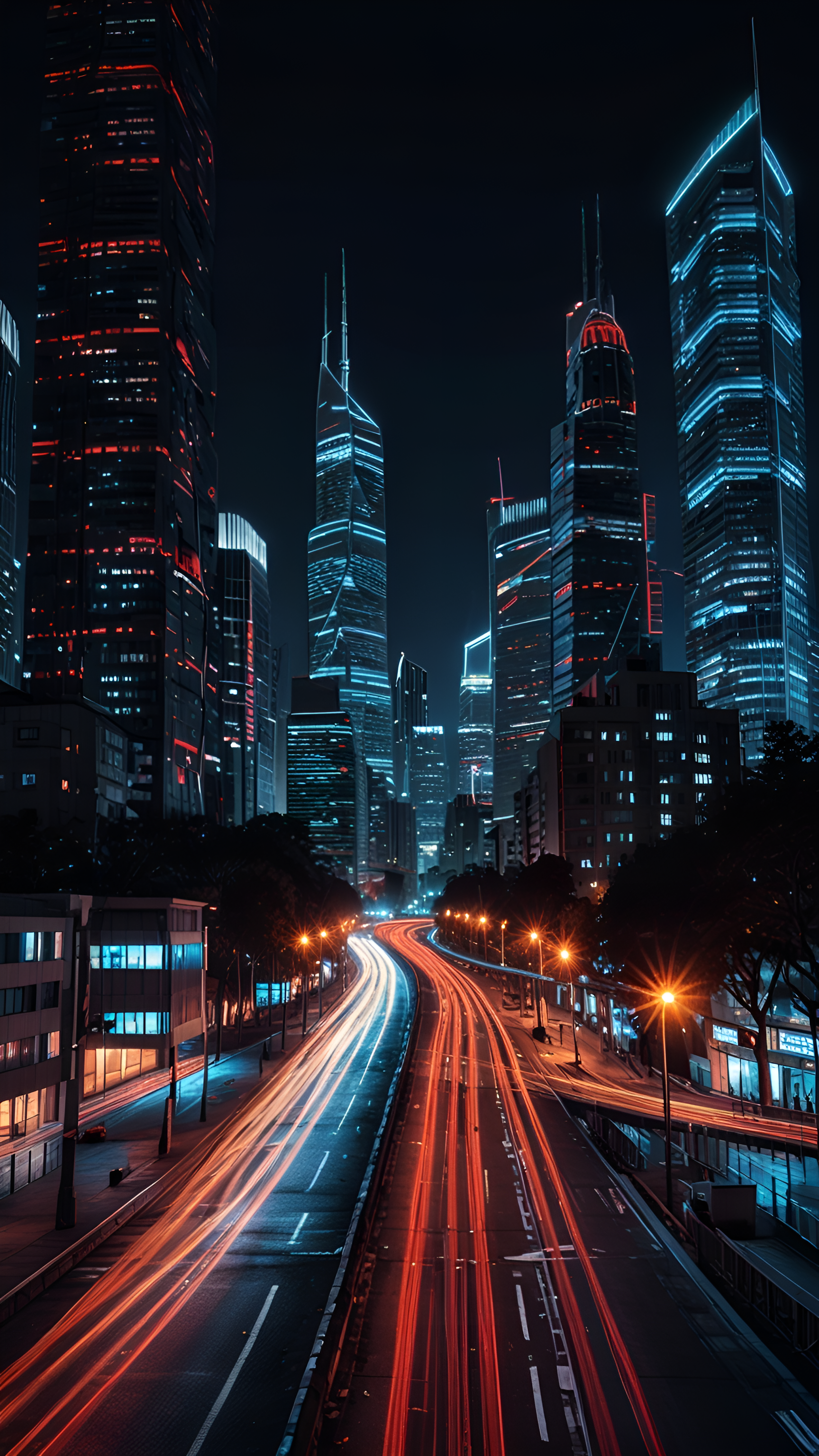 Immerse yourself in the vibrant energy of a futuristic city with this stunning wallpaper featuring a neon-lit skyline. The image captures a bustling urban scene at night, where towering skyscrapers adorned with luminous lights create a breathtaking backdrop. The dynamic light trails of moving vehicles on the road add a sense of motion and life to the composition, making it perfect for fans of modern architecture and urban aesthetics. Ideal for desktops, laptops, tablets, and smartphones, this wallpaper brings a lively and high-tech ambiance to your digital space.