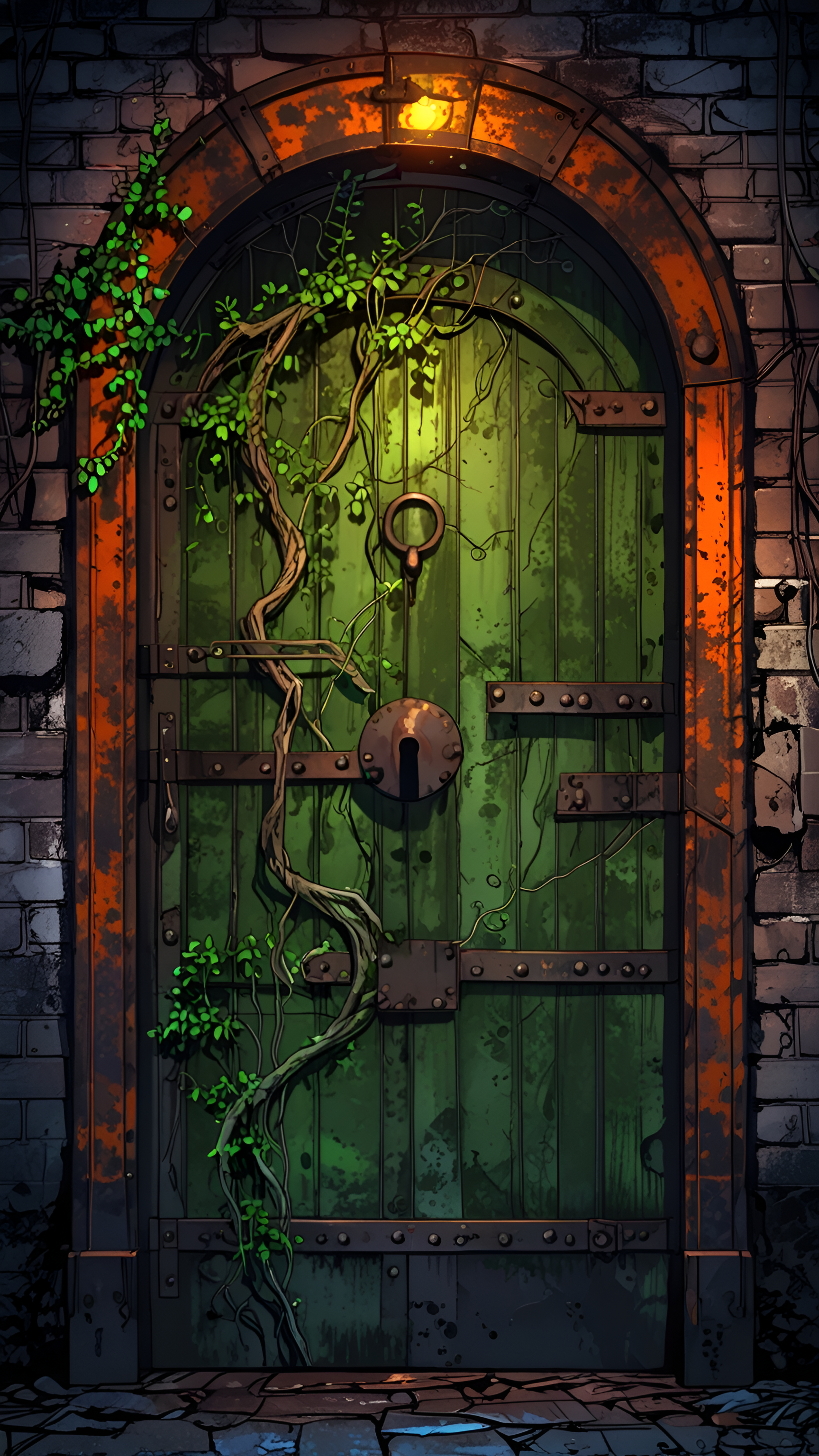 Discover the charm of an enchanted green door adorned with ivy and glowing light, perfect for adding a touch of mystery and tranquility to your screens