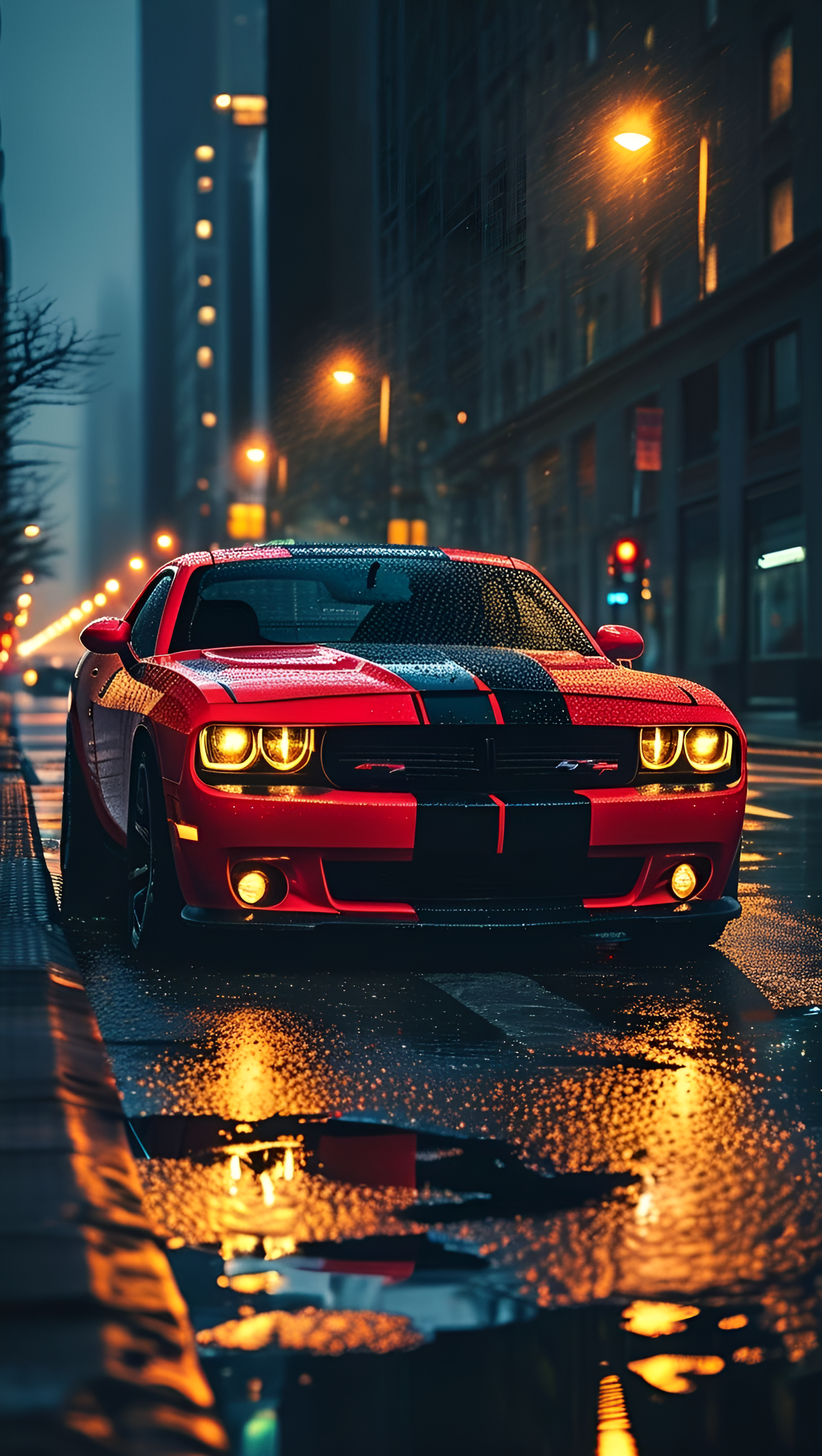Experience the allure of urban nightlife with this striking wallpaper featuring a red sports car parked on a rain-soaked city street. The vibrant car, with its sleek lines and bold design, stands out against the backdrop of glistening pavement and softly glowing streetlights. Raindrops create a mesmerizing effect, reflecting the city lights and adding depth to this captivating scene. Perfect for automotive enthusiasts and city lovers, this image embodies the excitement of nighttime adventures. Ideal for desktops, tablets, or smartphones, this wallpaper brings a touch of sophistication and energy to your digital space.