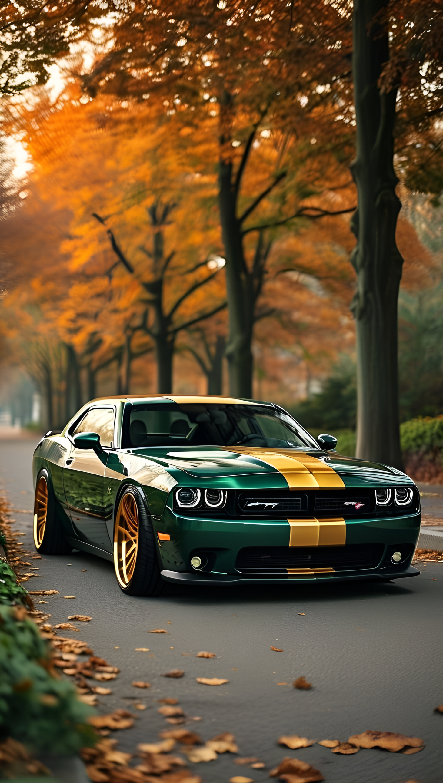 Capture the essence of automotive excellence with this striking wallpaper featuring a green and gold Dodge Challenger parked on a serene autumn road. Surrounded by vibrant fall foliage, the car's bold colors and sleek design create a stunning contrast against the backdrop of golden leaves and trees. This image embodies the spirit of adventure and the thrill of driving, making it perfect for car enthusiasts and nature lovers alike. Ideal for desktops, tablets, or smartphones, this wallpaper adds a touch of elegance and excitement to your digital space.