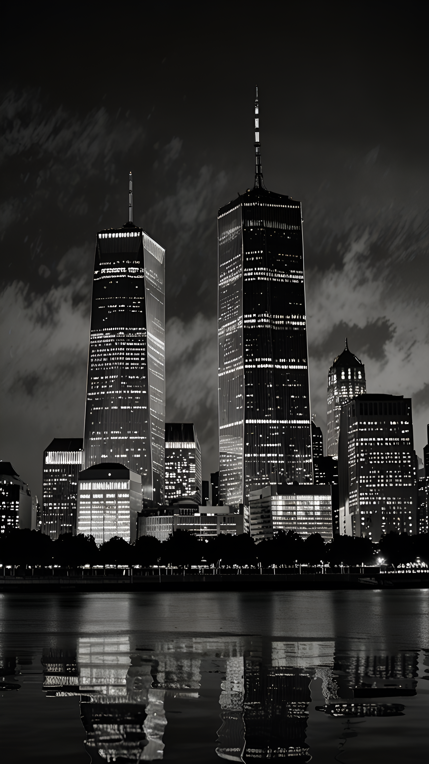 Discover the elegance of urban architecture with this stunning black and white wallpaper showcasing iconic skyscrapers reflecting majestically in the water. The dramatic contrast of the dark silhouettes against the soft glow of city lights creates a timeless and sophisticated atmosphere. This captivating scene captures the essence of a bustling metropolis, making it perfect for those who appreciate the beauty of city life and architectural design. Ideal for desktops, tablets, or smartphones, this wallpaper adds a touch of class and modernity to your digital space.
