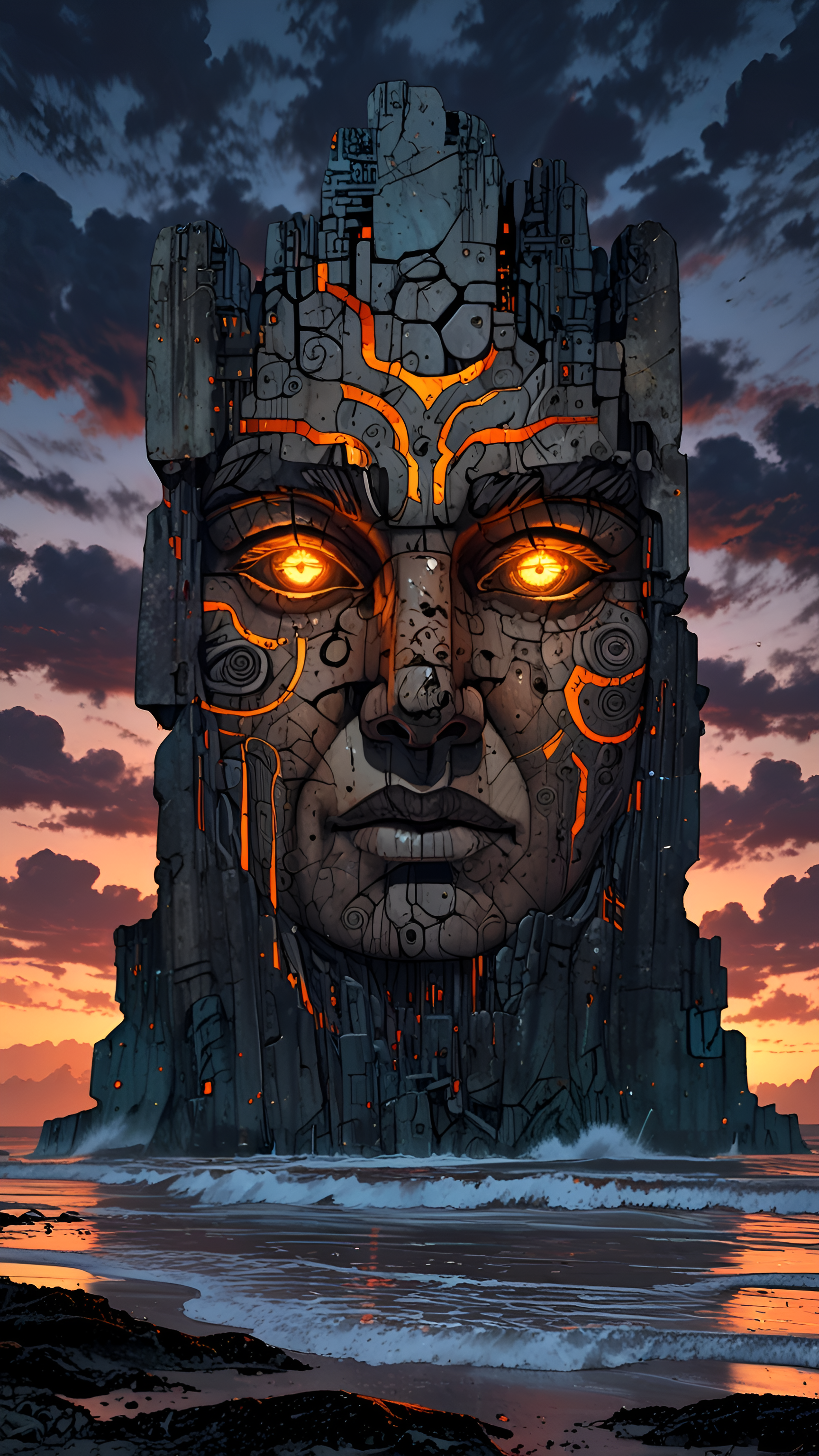 Explore the mysterious allure of this stunning wallpaper, showcasing a colossal futuristic stone structure rising majestically from a tranquil ocean shore at sunset. The intricate designs and glowing elements of the monument contrast beautifully with the vibrant hues of the sky, creating a captivating visual experience. Waves gently lap against the rocky beach, reflecting the warm colors of the sunset, while the dramatic clouds add depth and intrigue to the scene. Perfect for fans of sci-fi and fantasy art, this wallpaper brings an otherworldly touch to your digital devices, making it an ideal choice for desktops, tablets, or smartphones.
