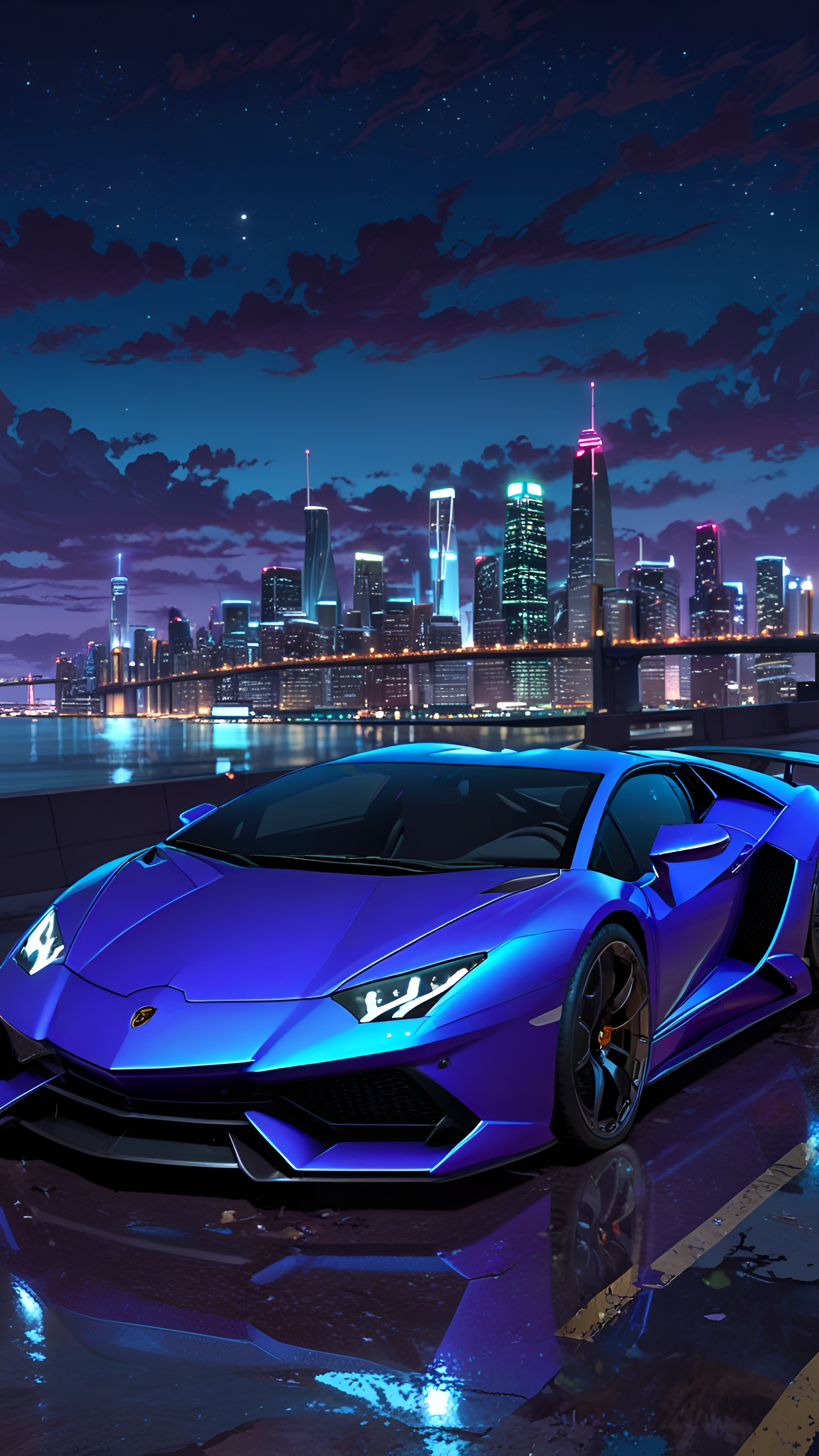 Elevate your digital space with this breathtaking wallpaper featuring a striking purple Lamborghini parked against a dazzling city skyline at night. The car's bold design and rich color pop against the backdrop of illuminated skyscrapers and a starry sky, creating a scene that embodies luxury and speed. Raindrops on the pavement reflect the city lights, enhancing the overall allure of this urban landscape. Perfect for car enthusiasts and lovers of modern aesthetics, this image captures the essence of high-performance vehicles in a stunning setting. Ideal for desktops, tablets, or smartphones, this wallpaper adds a touch of sophistication and excitement to your device.