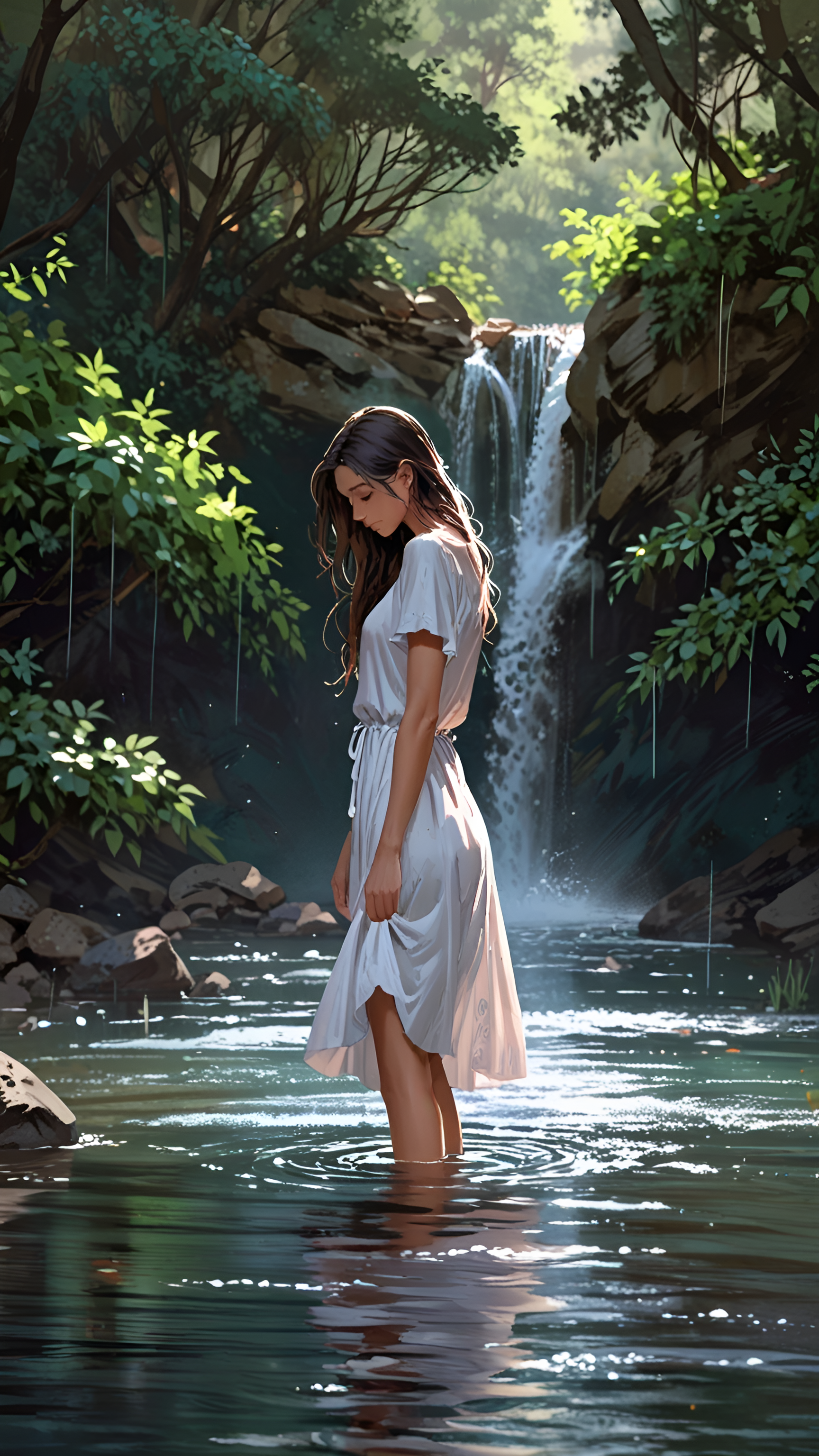 Immerse yourself in the serenity of nature with this stunning wallpaper featuring a woman standing gracefully in a tranquil stream, surrounded by lush greenery and a picturesque waterfall. The gentle flow of water and the vibrant foliage create a peaceful atmosphere, inviting viewers to escape into this idyllic setting. This image captures the essence of relaxation and harmony with nature, making it perfect for those who appreciate calming landscapes. Ideal for desktops, tablets, or smartphones, this wallpaper brings a touch of tranquility and beauty to your digital space.