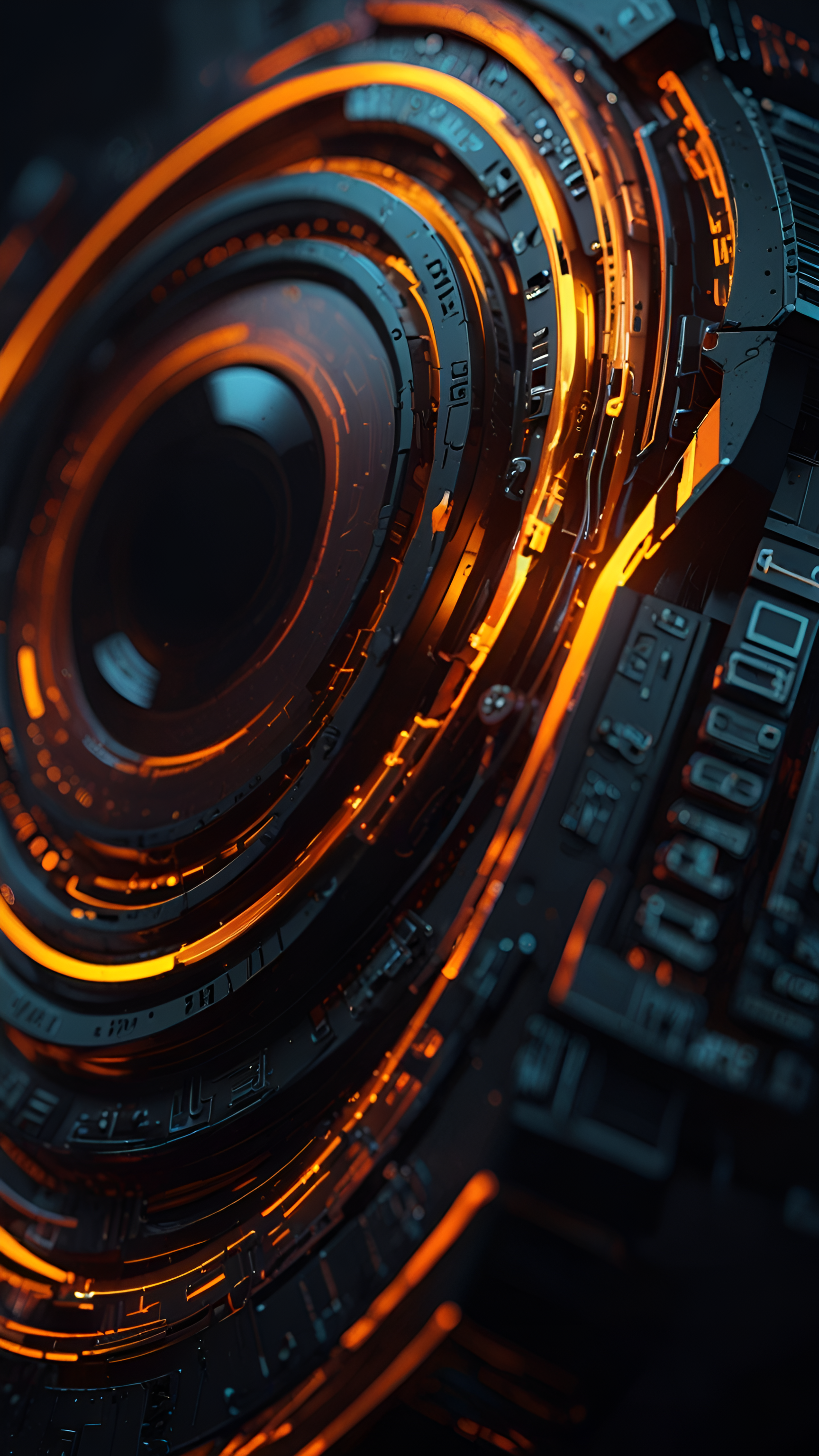 Elevate your digital workspace with this stunning wallpaper showcasing a futuristic abstract design featuring intricate glowing orange circular patterns set against a dark background. The mesmerizing details and high-tech aesthetics create a captivating visual experience, making it perfect for fans of technology and sci-fi. Ideal for desktops, laptops, tablets, and smartphones, this wallpaper adds a modern touch to any device, inspiring creativity and innovation in your everyday life.