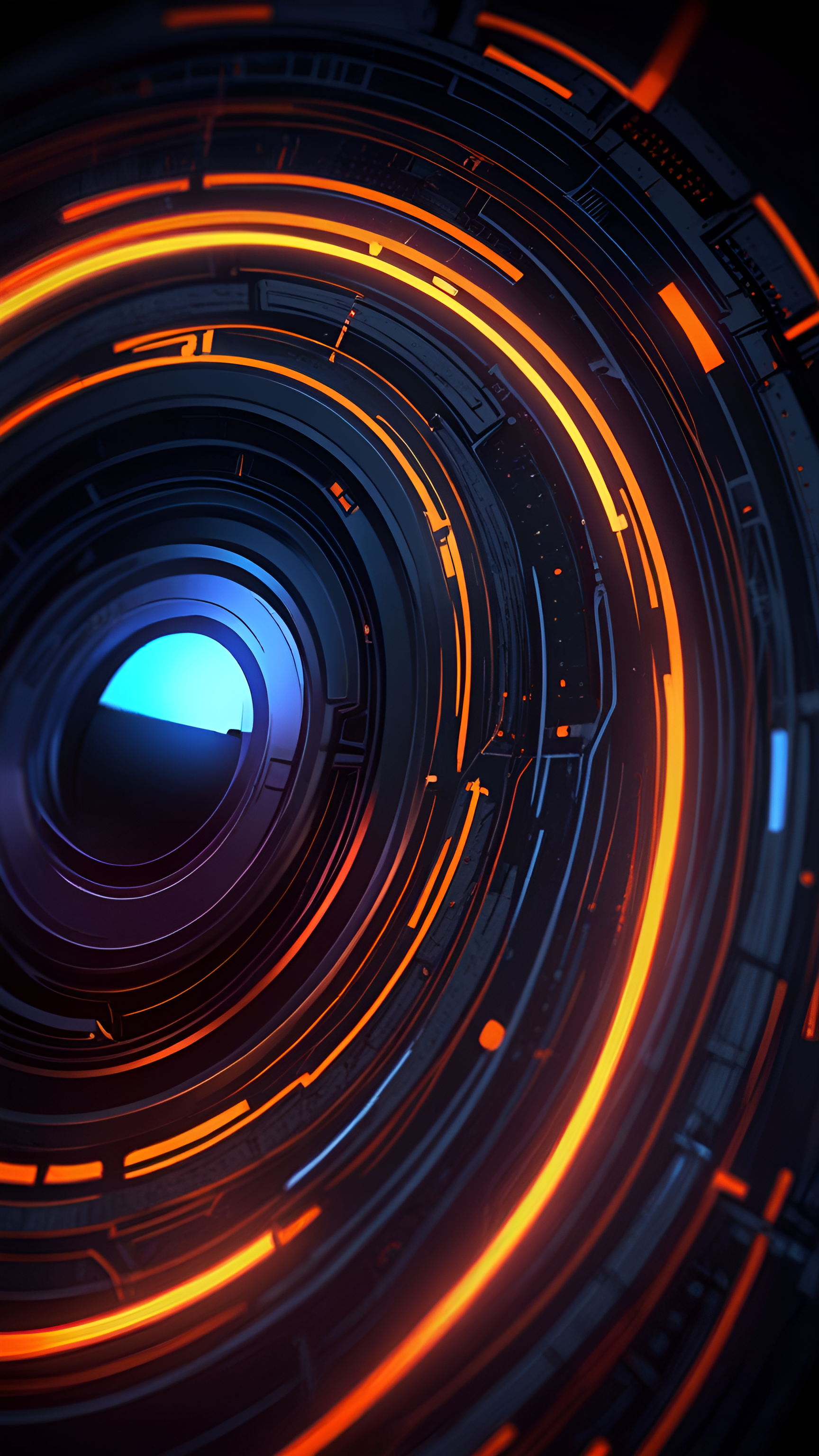 Transform your digital space with this captivating wallpaper featuring futuristic abstract circular patterns illuminated by vibrant orange and blue lights. The intricate design creates a sense of depth and movement, drawing viewers into a world of high-tech aesthetics and modern artistry. Perfect for fans of sci-fi, technology, and digital art, this wallpaper is ideal for desktops, laptops, tablets, and smartphones, adding a dynamic and contemporary touch to your screens. Experience the fusion of color and form with this stunning visual that inspires creativity and innovation.