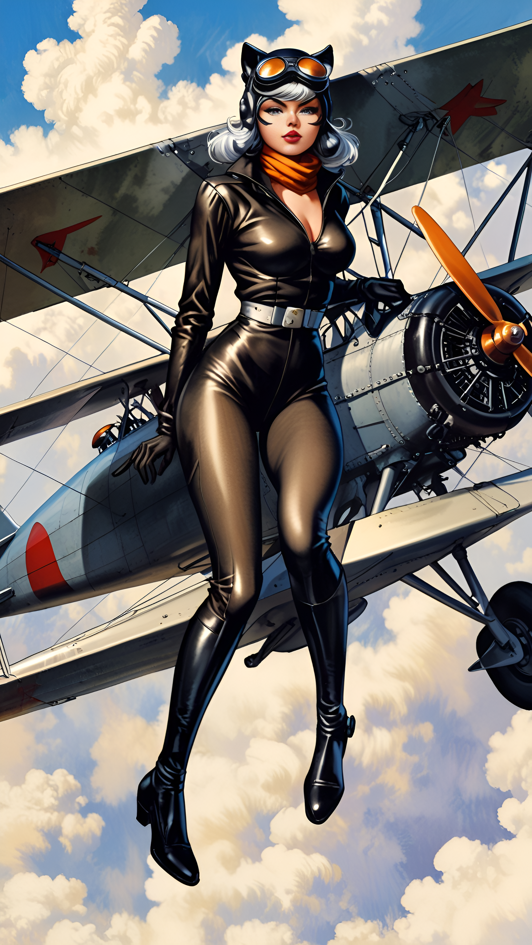 Experience the thrill of aviation with this captivating wallpaper featuring a stylish female pilot clad in a sleek black flight suit, soaring through the skies in a vintage aircraft. The vibrant colors of the plane and the dynamic clouds create a sense of adventure and nostalgia. This artwork captures the essence of classic aviation and the spirit of exploration, making it perfect for aviation enthusiasts, retro lovers, and anyone who dreams of the skies. Ideal for desktops, laptops, tablets, and smartphones, this wallpaper brings a unique blend of style and adventure to your digital devices.