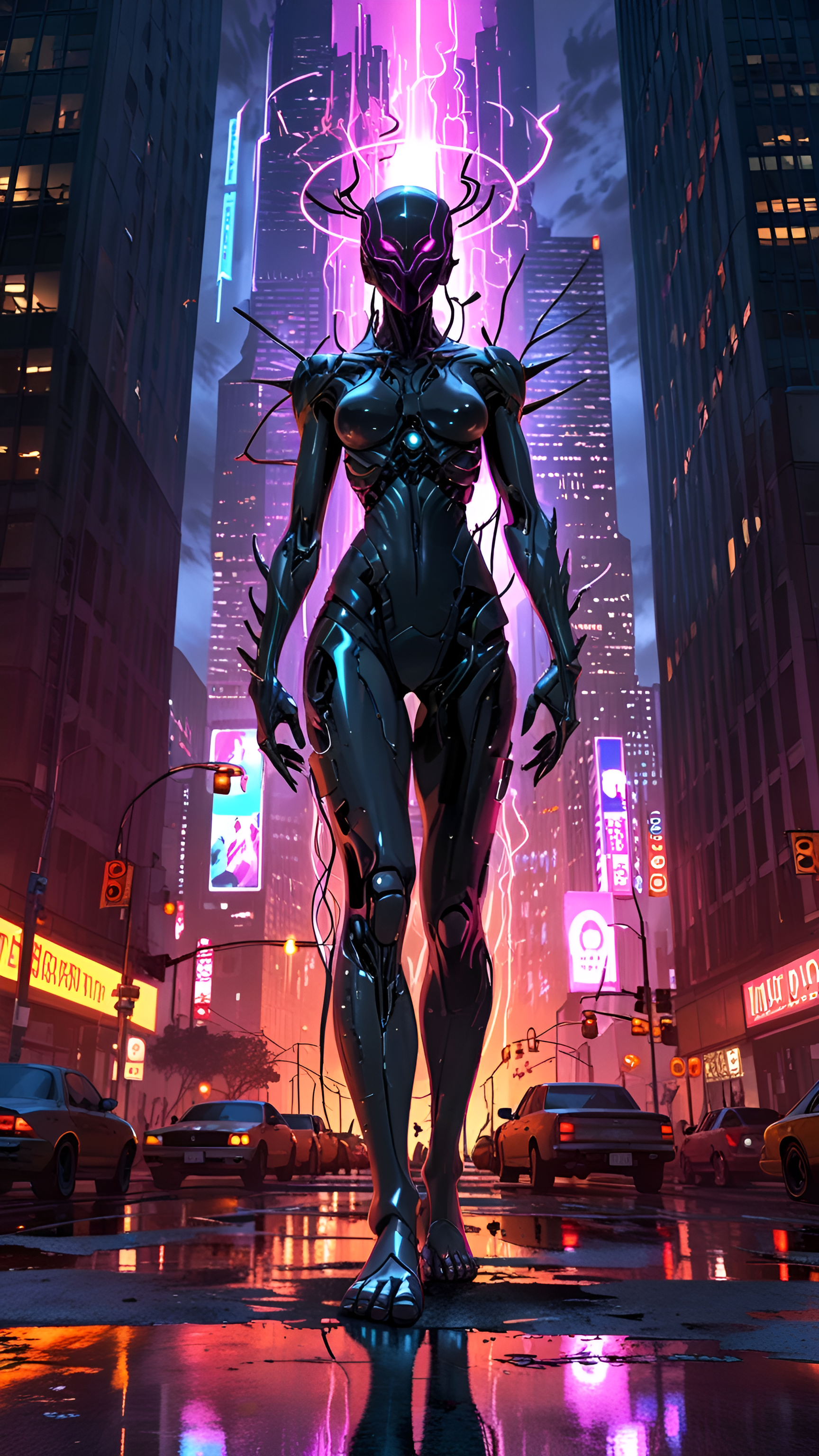 Download WallpaperFuturistic Robot in Neon City: Cyberpunk Wallpaper