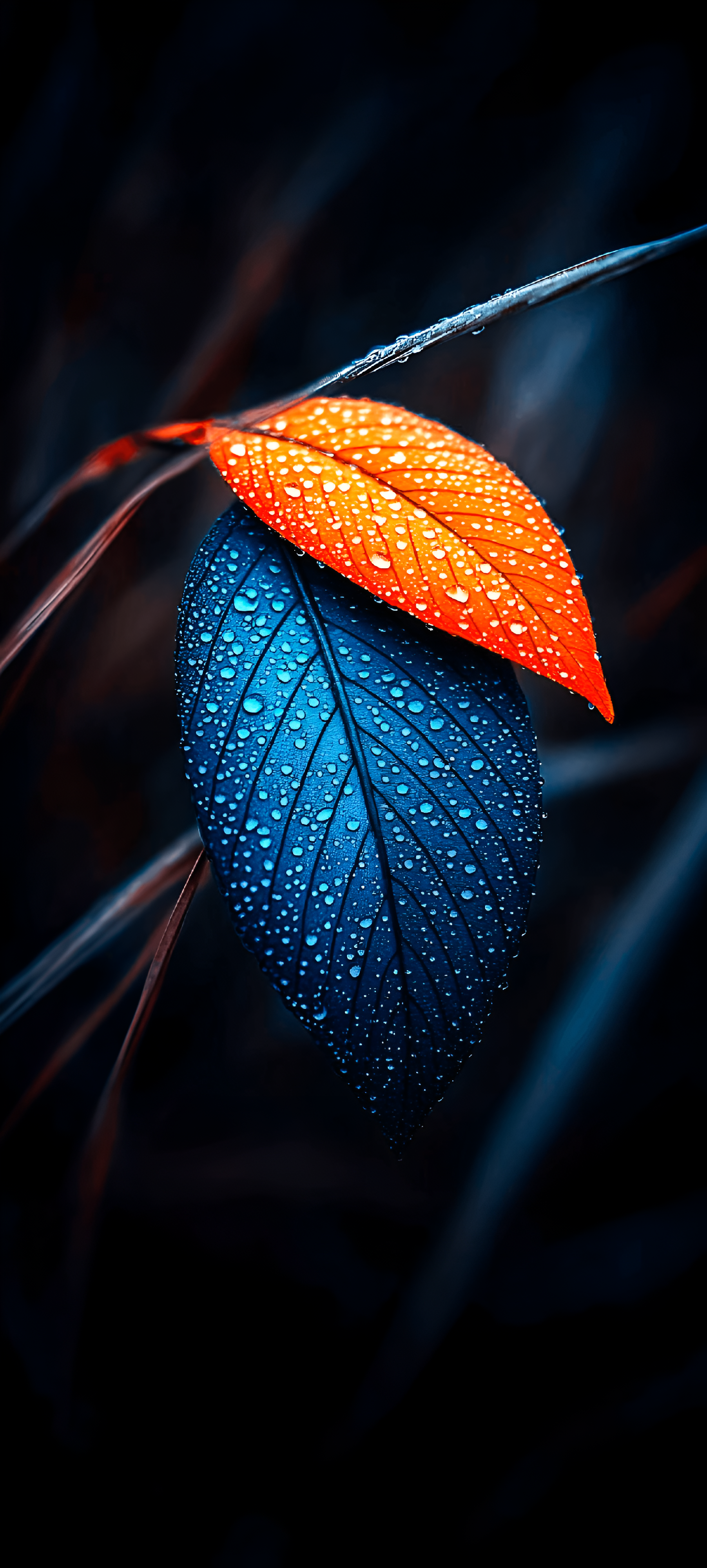 Immerse yourself in the beauty of nature with this stunning wallpaper featuring two vibrant leaves, one a striking orange and the other a deep blue, adorned with glistening droplets of water. Set against a dark background, this artwork highlights the captivating contrast between the colors and textures of the leaves, creating a visually striking composition. Perfect for nature lovers, botanical enthusiasts, or anyone looking to add a touch of elegance to their digital space, this wallpaper is ideal for desktops, laptops, tablets, and smartphones. Bring the beauty of the outdoors into your home or office with this exquisite design.