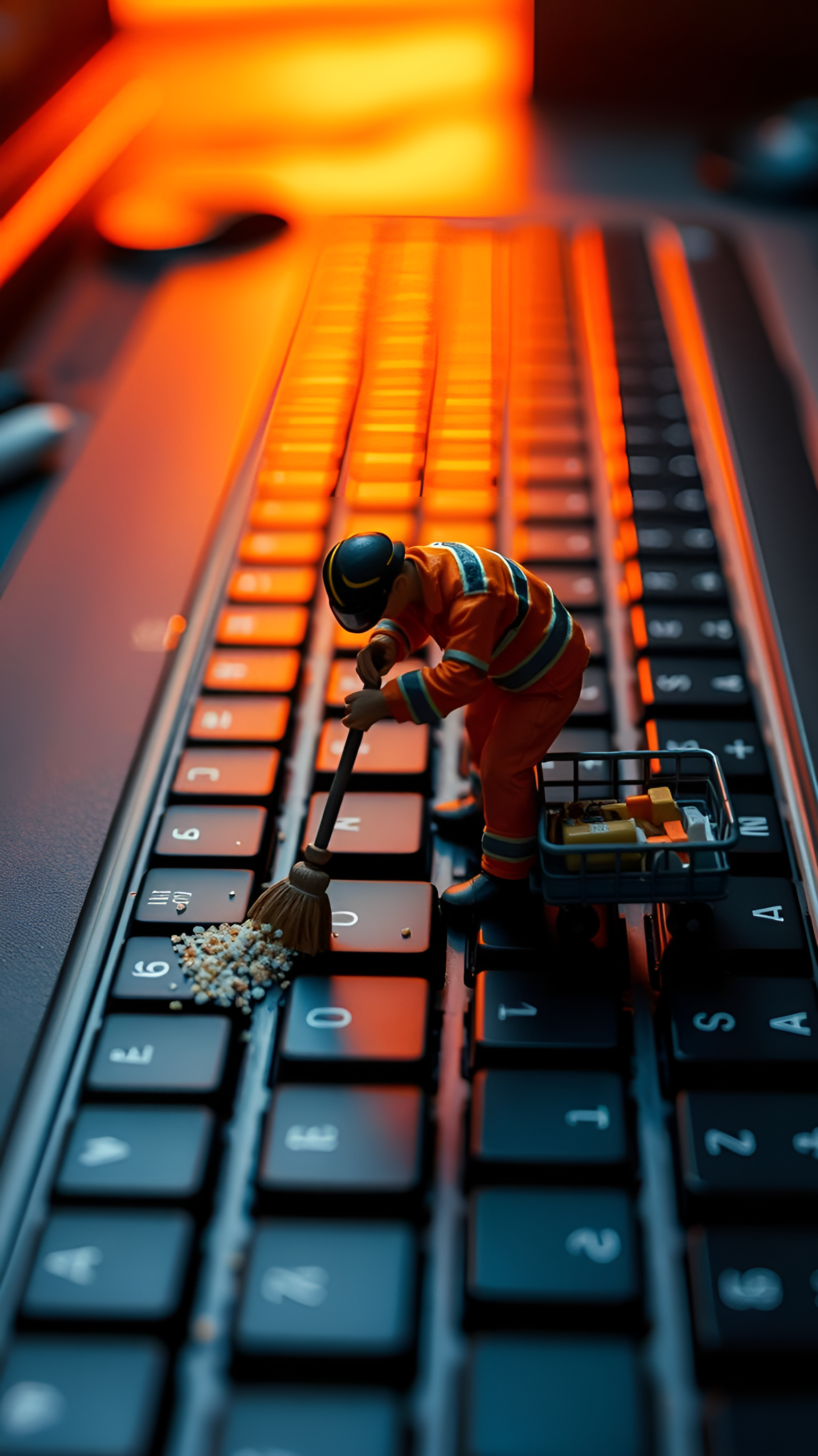 Experience the quirky side of technology with this captivating wallpaper featuring a miniature worker diligently cleaning a keyboard. The vibrant orange glow in the background adds a modern and dynamic feel, while the tiny figure, equipped with a broom and a cart filled with supplies, brings a sense of whimsy and creativity to your digital space. This unique artwork is perfect for tech enthusiasts, gamers, or anyone who appreciates a playful take on everyday objects. Ideal for desktops, laptops, tablets, and smartphones, this wallpaper adds a touch of humor and charm to your devices.