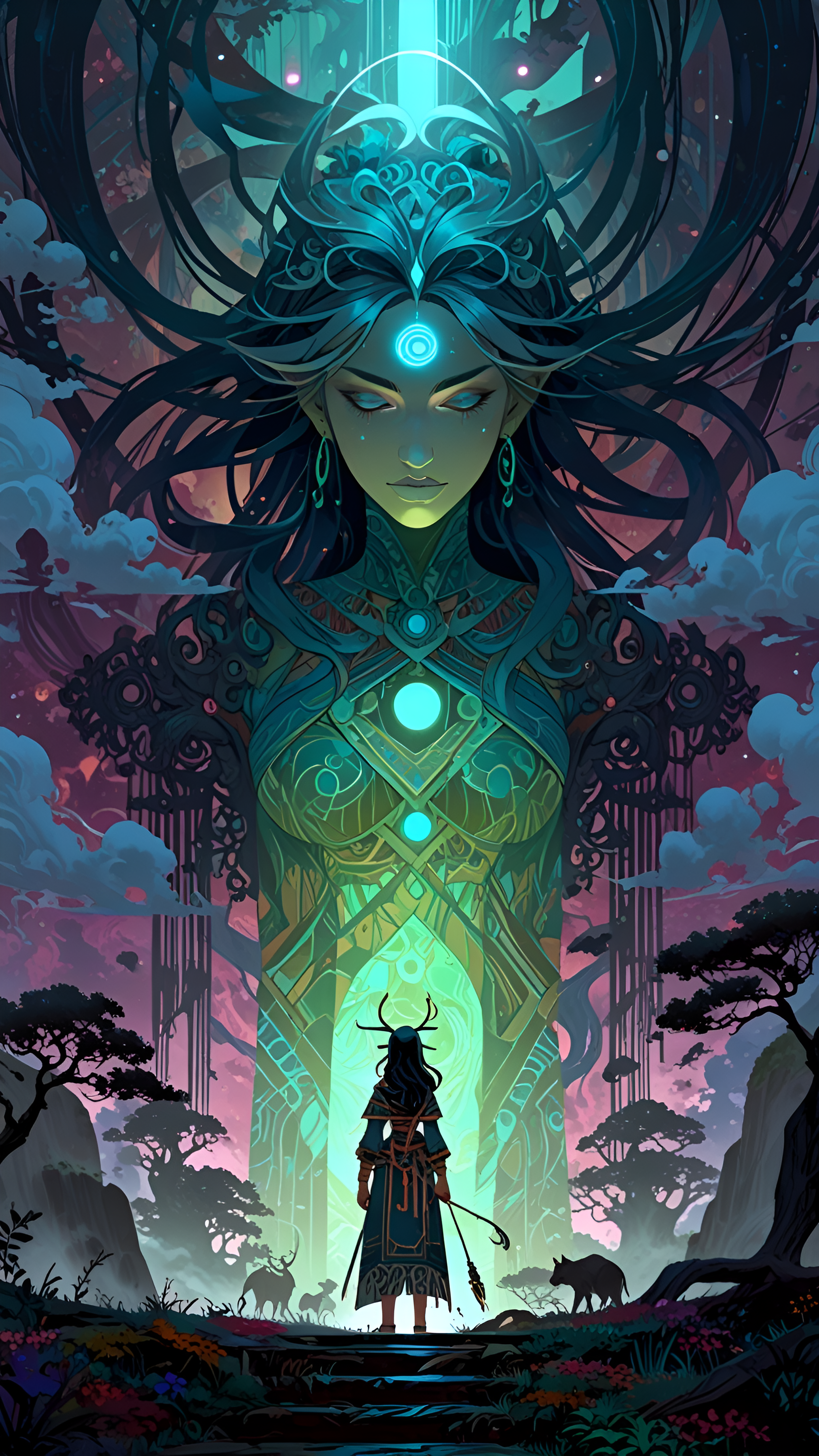 Step into a world of magic and wonder with this breathtaking wallpaper featuring a mystical figure standing before a majestic, illuminated structure. Surrounded by an ethereal landscape filled with vibrant colors and enchanting flora, this artwork captures the essence of fantasy and adventure. The figure, adorned in intricate robes and holding a staff, gazes at the towering structure that radiates a mesmerizing glow, inviting viewers to explore the mysteries of this enchanted realm. Perfect for fans of fantasy art, mythology, and magical landscapes, this wallpaper is ideal for desktops, laptops, tablets, and smartphones, adding a touch of wonder to your digital space.