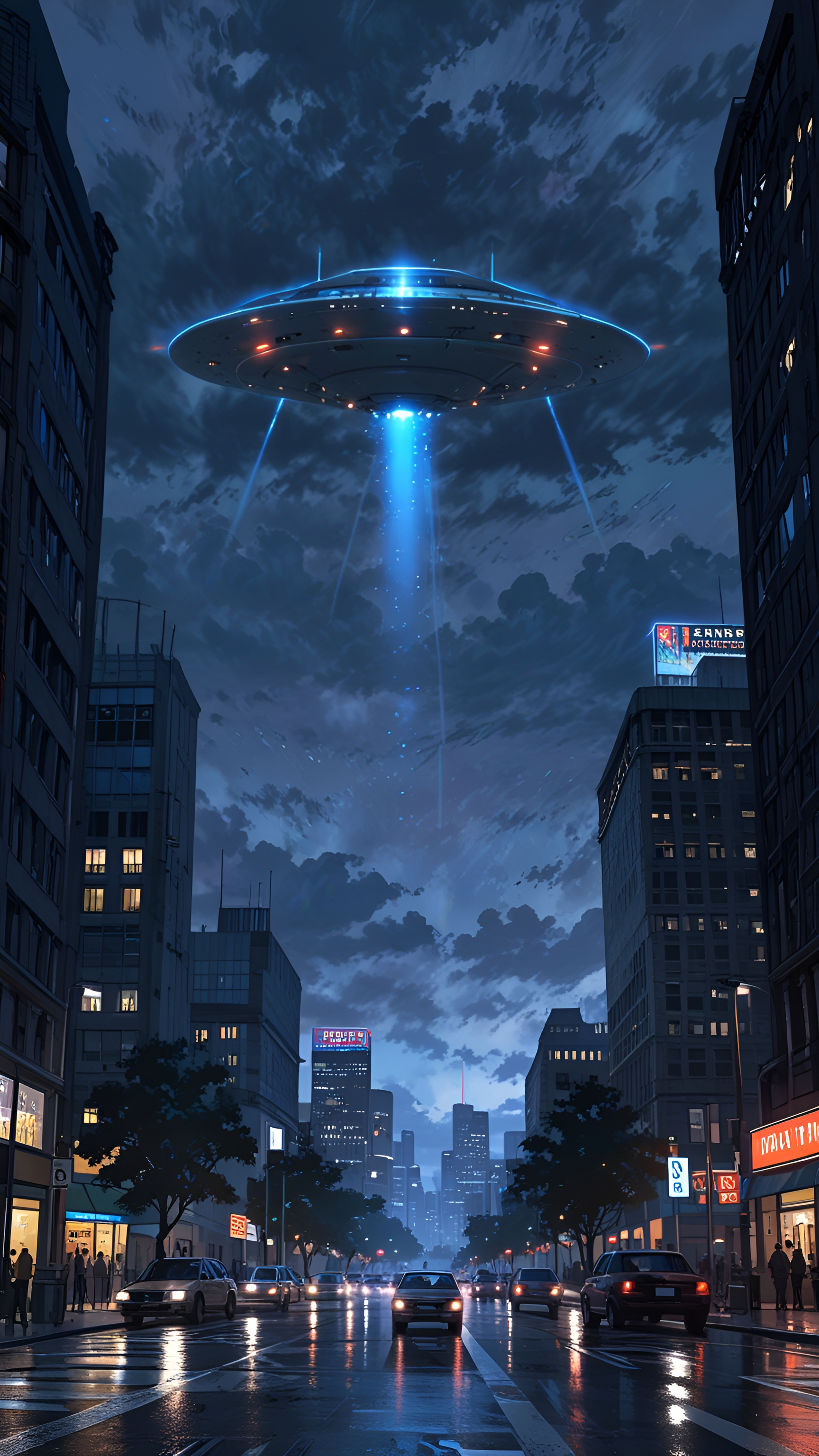 Experience the thrill of the unknown with this captivating wallpaper showcasing a UFO hovering above a vibrant urban street at night. The futuristic spacecraft, illuminated by brilliant blue lights, casts an otherworldly glow over the cityscape, while the reflections on the wet pavement enhance the dramatic atmosphere. This artwork beautifully combines elements of science fiction and urban life, making it a perfect choice for fans of UFO lore, sci-fi enthusiasts, and urban art lovers. Ideal for desktops, laptops, tablets, and smartphones, this wallpaper adds a sense of mystery and excitement to your digital environment.