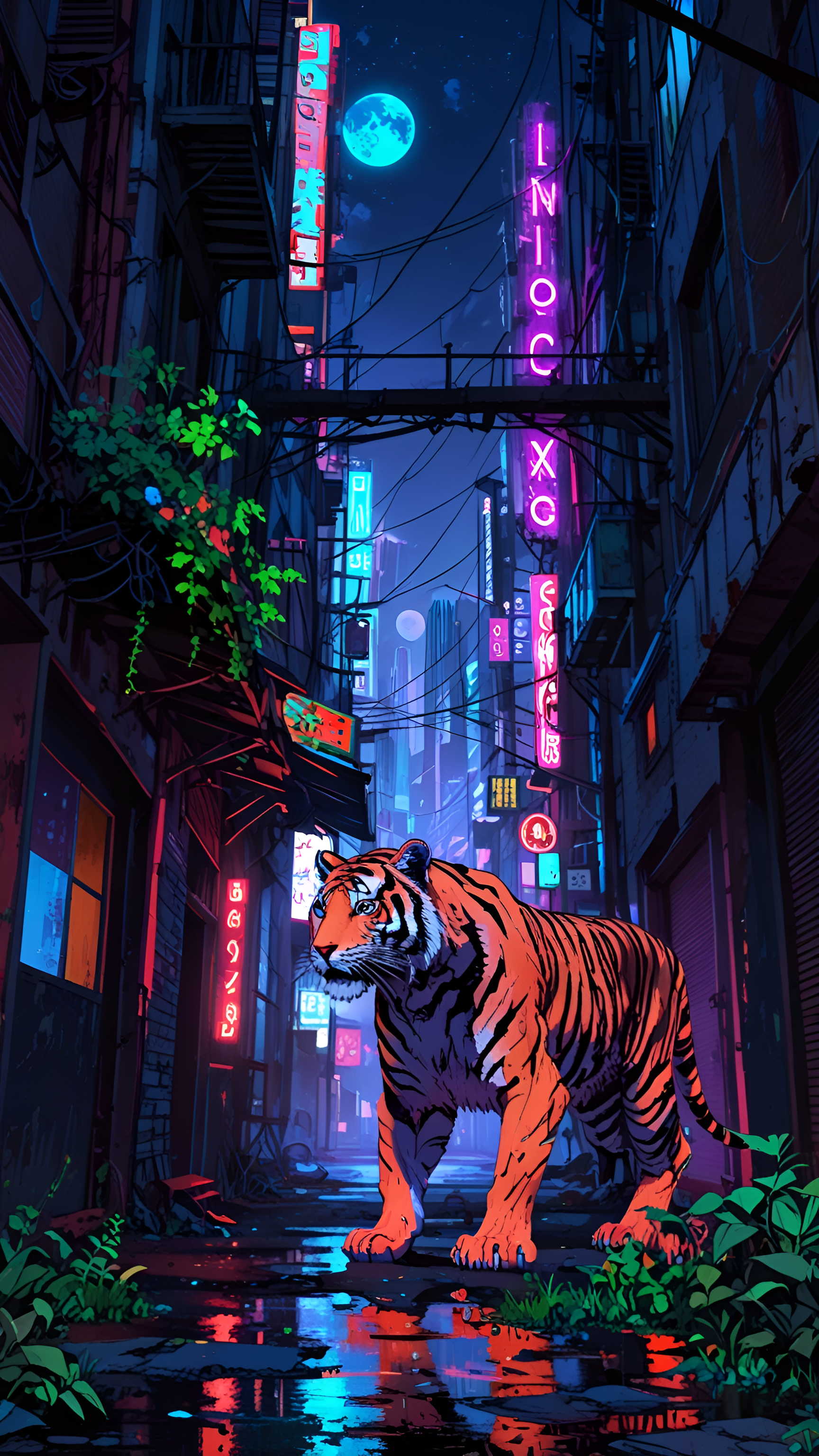 Step into a captivating urban jungle with this stunning wallpaper featuring a vibrant tiger roaming through a neon-lit alley. Set against a backdrop of glowing signs and a mystical blue moon, the scene captures the essence of a futuristic city where nature and technology coexist. The tiger, with its striking orange and black stripes, stands out against the colorful reflections on the wet pavement, creating a mesmerizing contrast. Perfect for wildlife enthusiasts and fans of neon art, this wallpaper is ideal for desktops, laptops, tablets, and smartphones, bringing an electrifying touch to your digital space.