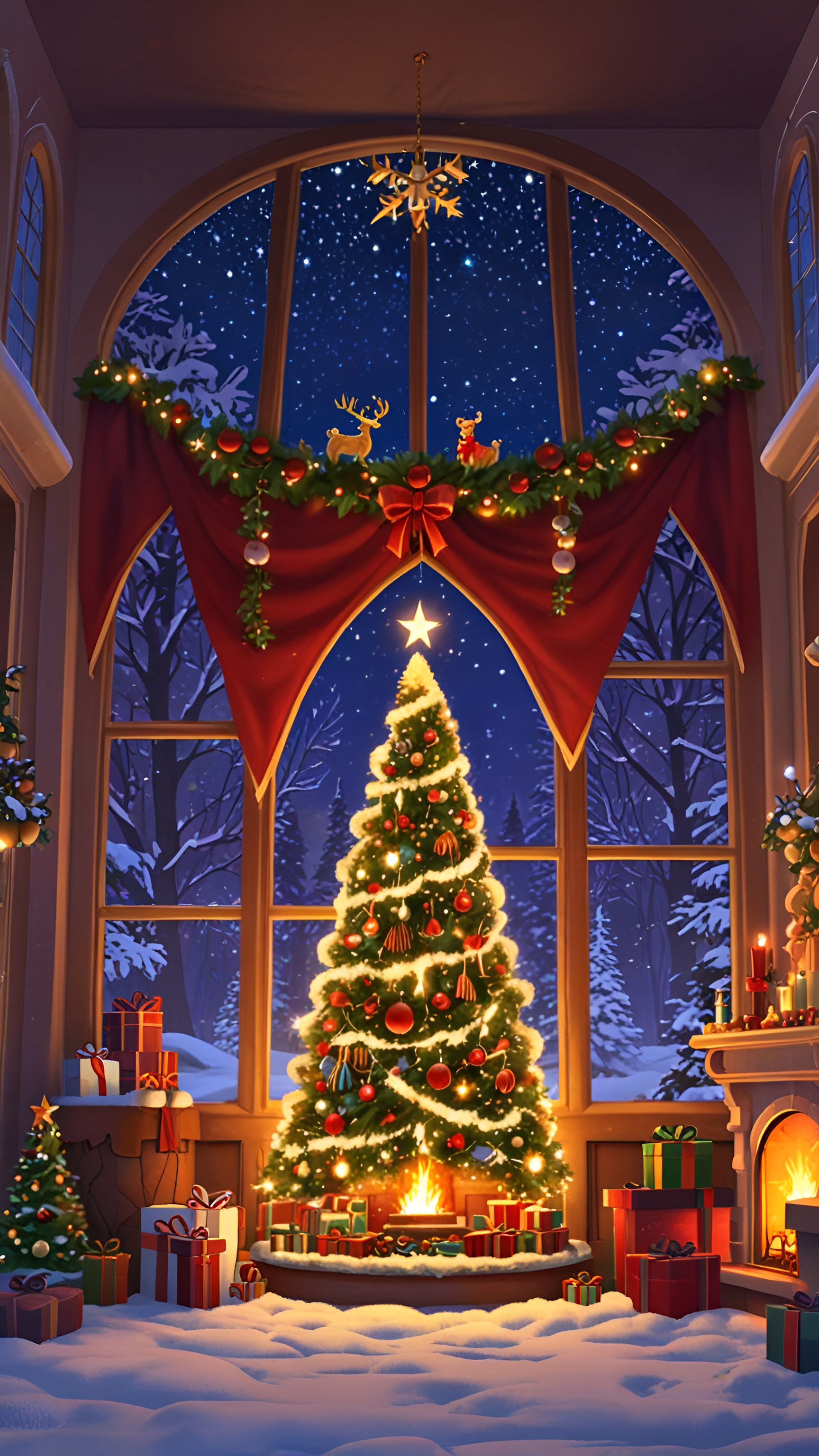 Embrace the warmth of the holiday season with this enchanting wallpaper showcasing a beautifully decorated Christmas tree, adorned with sparkling lights and colorful ornaments, standing proudly in a cozy living room. The scene is illuminated by the soft glow of a crackling fireplace, surrounded by an array of beautifully wrapped presents. Snow gently falls outside the large windows, creating a serene winter wonderland backdrop. Ideal for those who cherish the magic of Christmas, this wallpaper adds a touch of festive charm to your desktops, laptops, tablets, and smartphones, making it perfect for celebrating the holidays.