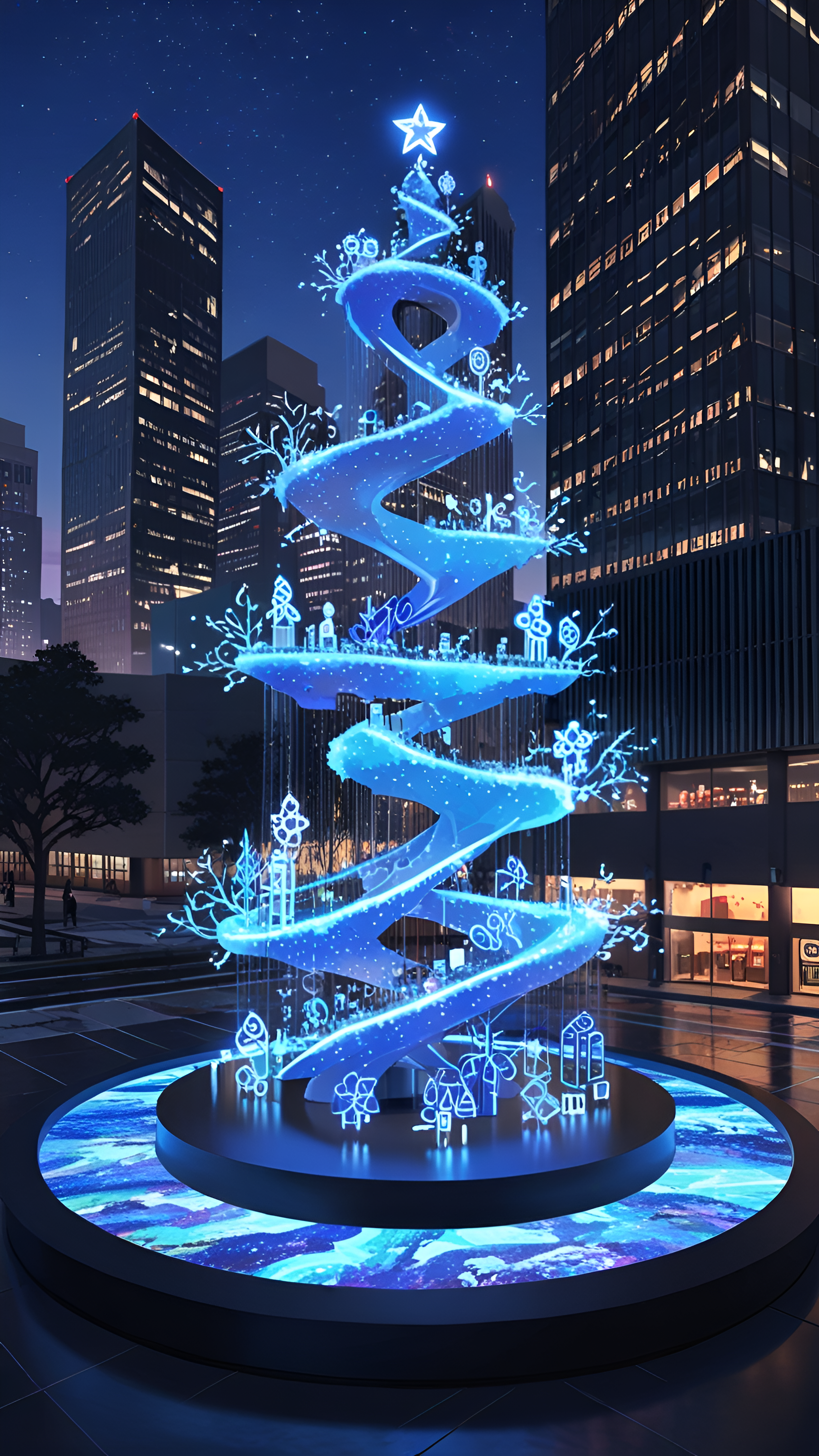 Experience the magic of the holidays with this breathtaking wallpaper showcasing a beautifully illuminated Christmas tree spiraling with vibrant blue lights, set against a stunning urban backdrop. The tree, adorned with whimsical decorations and a glowing star on top, creates a captivating focal point amid the towering skyscrapers. The shimmering base and intricate details of the ornaments reflect the festive spirit of the season, making it a perfect addition to your digital devices. Ideal for those who love modern holiday aesthetics and city life, this wallpaper brings a touch of enchantment to desktops, laptops, tablets, and smartphones.