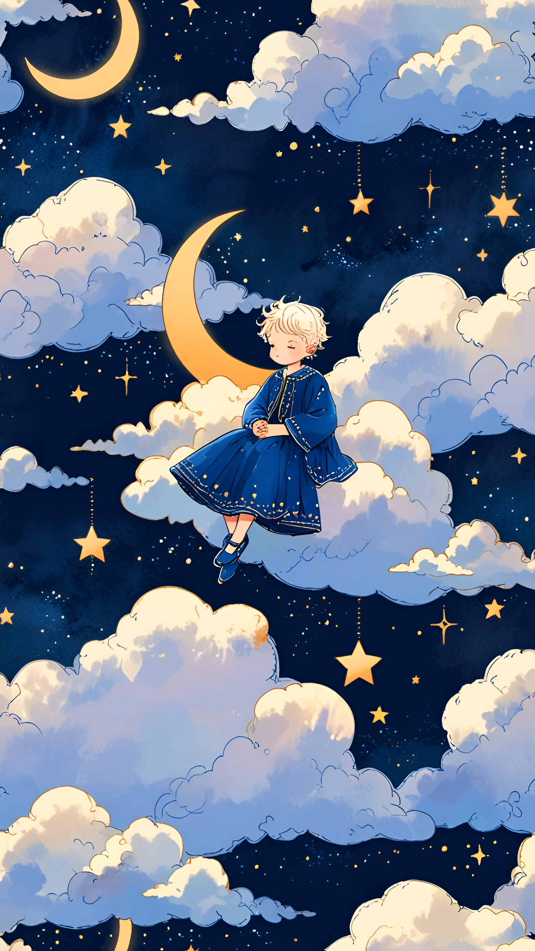 Immerse yourself in a world of dreams with this enchanting wallpaper featuring a whimsical illustration of a child peacefully resting on fluffy clouds. Surrounded by a starry night sky, crescent moons, and twinkling stars, this artwork captures the essence of childhood wonder and imagination. The soft color palette of blues and whites evokes a sense of calm and serenity, making it perfect for creating a tranquil atmosphere in any space. Ideal for children’s rooms, nurseries, or anyone who cherishes the magic of dreams, this wallpaper is perfect for desktops, laptops, tablets, and smartphones.