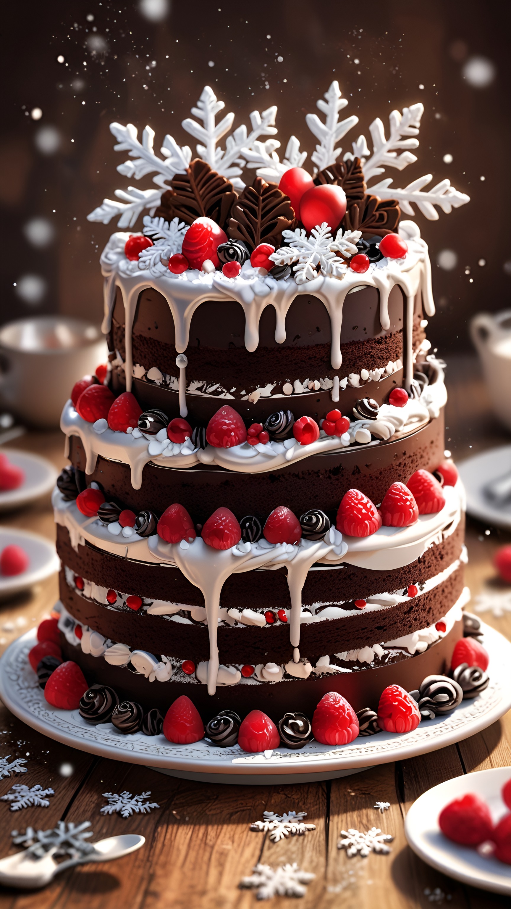 Indulge in the festive spirit with this stunning wallpaper showcasing a three-tiered chocolate cake elegantly adorned with white chocolate snowflakes, chocolate leaves, and a medley of fresh red berries. The cake, drizzled with creamy white icing, is set against a warm wooden backdrop, creating a cozy and inviting atmosphere. Perfect for dessert lovers and holiday enthusiasts, this image captures the essence of celebration and sweetness. Ideal for desktops, laptops, tablets, and smartphones, this wallpaper adds a delightful touch of joy and festivity to your digital space.
