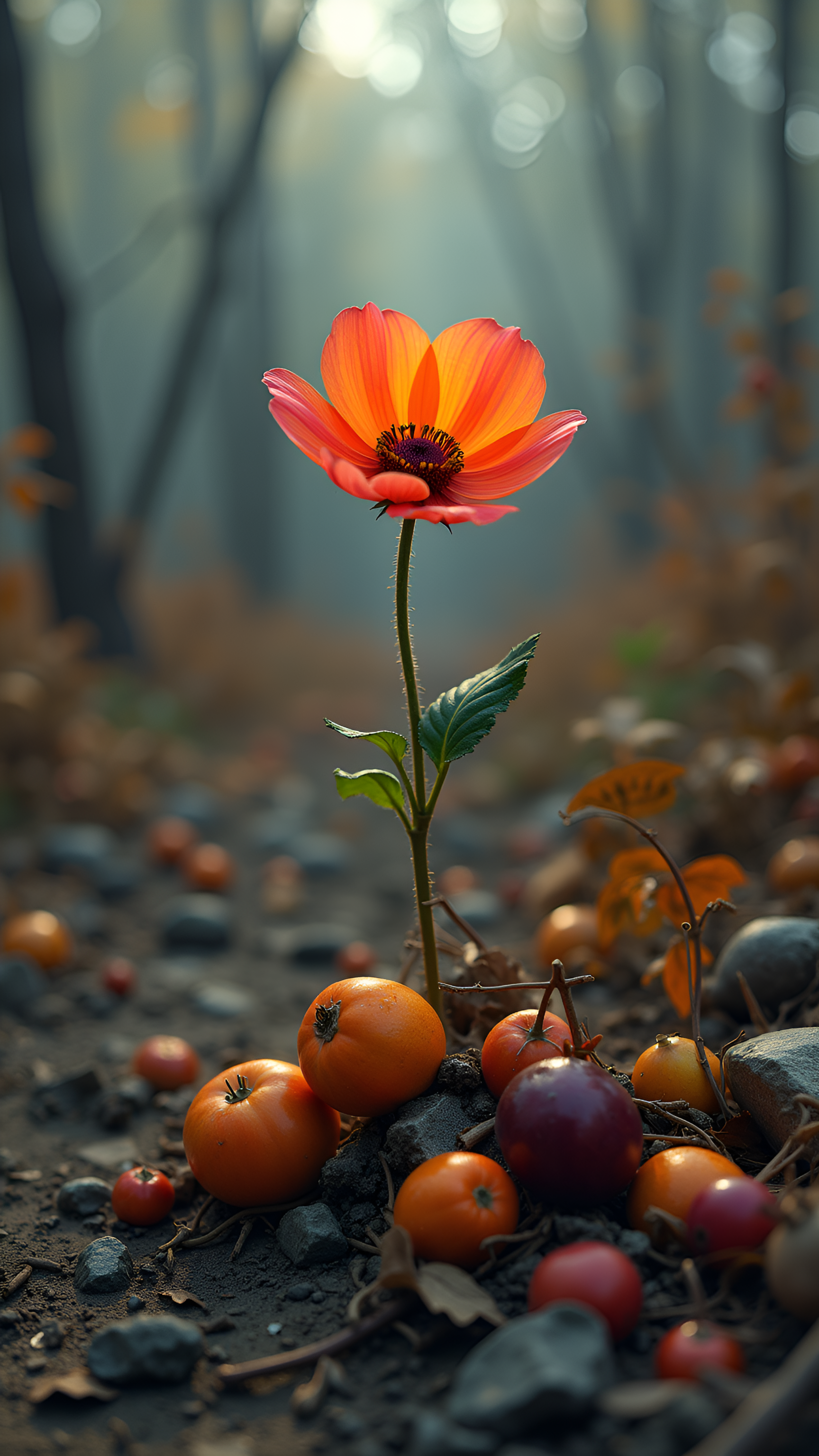 Experience the enchanting beauty of nature with this stunning wallpaper featuring a radiant flower standing tall amidst an array of colorful fruits. Set against a softly lit forest backdrop, the image captures the delicate balance of flora and fauna, showcasing the vivid hues of orange, red, and green. This captivating scene evokes a sense of tranquility and wonder, making it perfect for nature lovers and those seeking inspiration. Ideal for desktops, laptops, tablets, and smartphones, this wallpaper brings a touch of natural beauty to your digital environment.