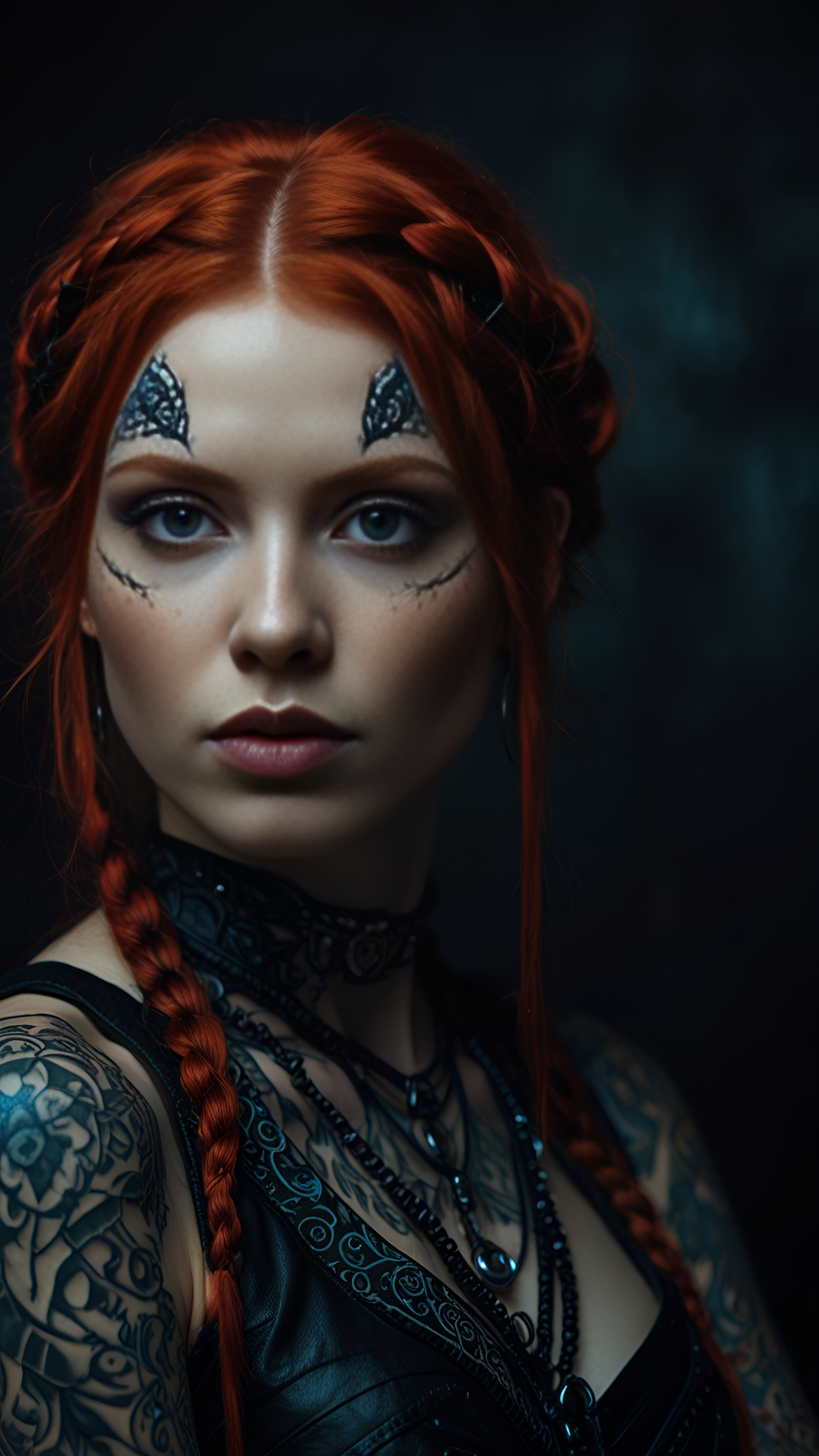 Step into a realm of fantasy with this captivating wallpaper showcasing a fierce character adorned with striking red hair styled in braids and intricate tattoos that tell a story of strength and resilience. The character's dark leather outfit, complemented by layered necklaces, enhances the mysterious and powerful aura. This wallpaper is perfect for fans of fantasy art, character design, and those who appreciate bold and dynamic imagery. Ideal for desktops, laptops, tablets, and smartphones, it adds an enchanting touch to your digital space, inspiring adventure and creativity.