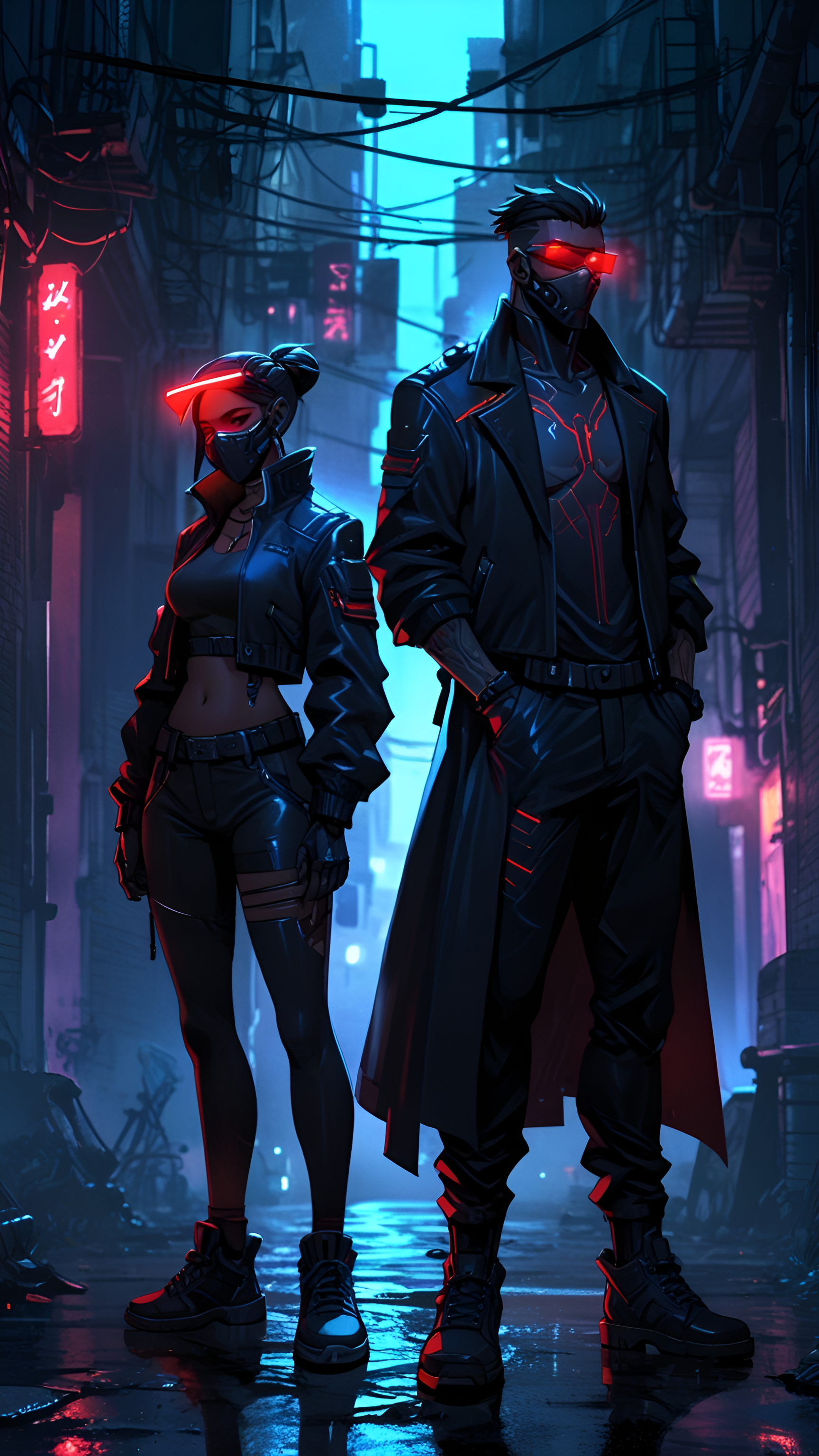 Step into a vibrant cyberpunk world with this striking wallpaper featuring a futuristic duo standing confidently in a neon-lit alley. Dressed in sleek black outfits with glowing accents, these characters embody the essence of high-tech urban life. The backdrop showcases a maze of wires and illuminated signs, creating an immersive atmosphere that captures the spirit of a neon city. Perfect for fans of sci-fi, gaming, and cyberpunk aesthetics, this wallpaper is ideal for desktops, laptops, tablets, and smartphones, adding a bold and dynamic touch to your digital space.