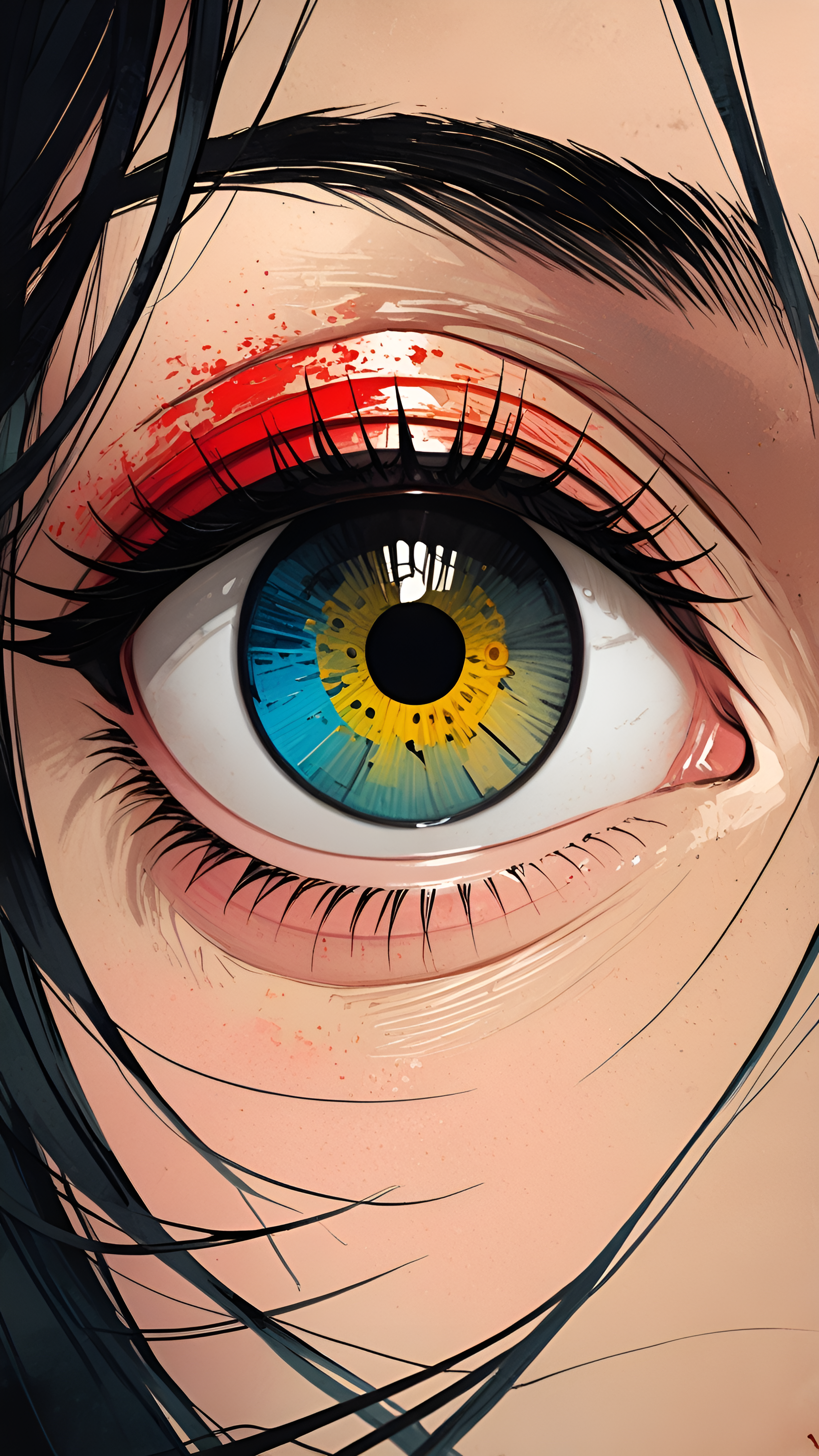 Explore the beauty of detail with this stunning close-up wallpaper featuring a captivating eye, showcasing a mesmerizing blend of colors. The vibrant blue and yellow iris is accentuated by bold red eyeshadow, creating a striking contrast that draws viewers in. The intricate details of the eyelashes and the subtle textures of the skin add depth and realism to this artwork. Perfect for fans of portrait art and those who appreciate the beauty of human expression, this wallpaper is ideal for adding a touch of artistry and intrigue to your digital devices.