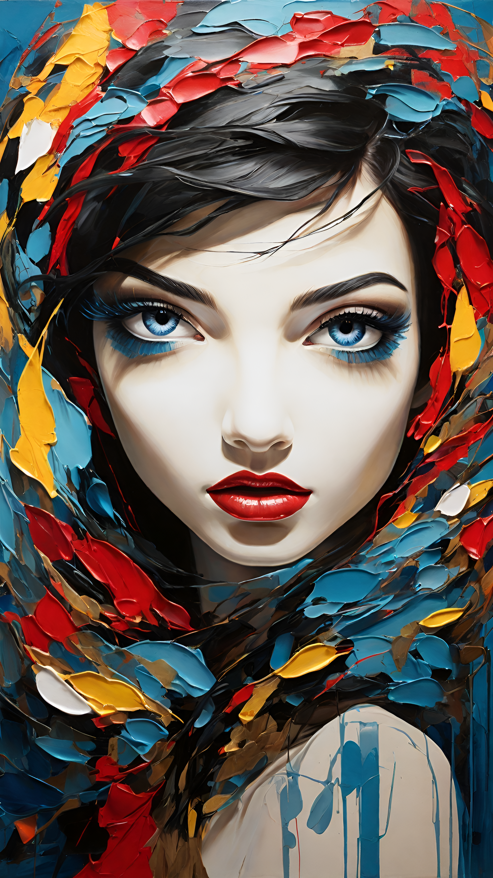 Transform your digital space with this captivating abstract swirl wallpaper, showcasing a dynamic interplay of bold colors including vibrant reds, deep blues, sunny yellows, and rich blacks. The energetic brush strokes create a sense of movement and depth, inviting viewers into a world of creativity and imagination. This artwork is perfect for those who appreciate modern art and want to add a touch of vibrancy to their devices. Ideal for creative professionals, art lovers, or anyone looking to inspire energy and passion in their workspace or personal devices.