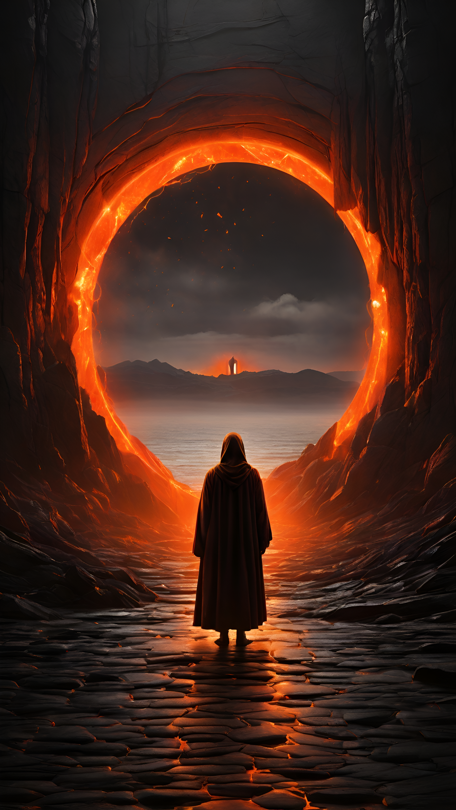 Embark on an epic adventure with this striking wallpaper that features a cloaked figure standing before a mesmerizing fiery portal. The intense glow of the molten lava contrasts beautifully with the dark, rocky landscape, creating a scene that is both dramatic and captivating. The distant silhouette of a tower on the horizon adds an element of mystery, inviting viewers to ponder the secrets that lie beyond the portal. This wallpaper is perfect for fans of fantasy and adventure, offering a stunning backdrop that sparks the imagination and evokes a sense of wonder.