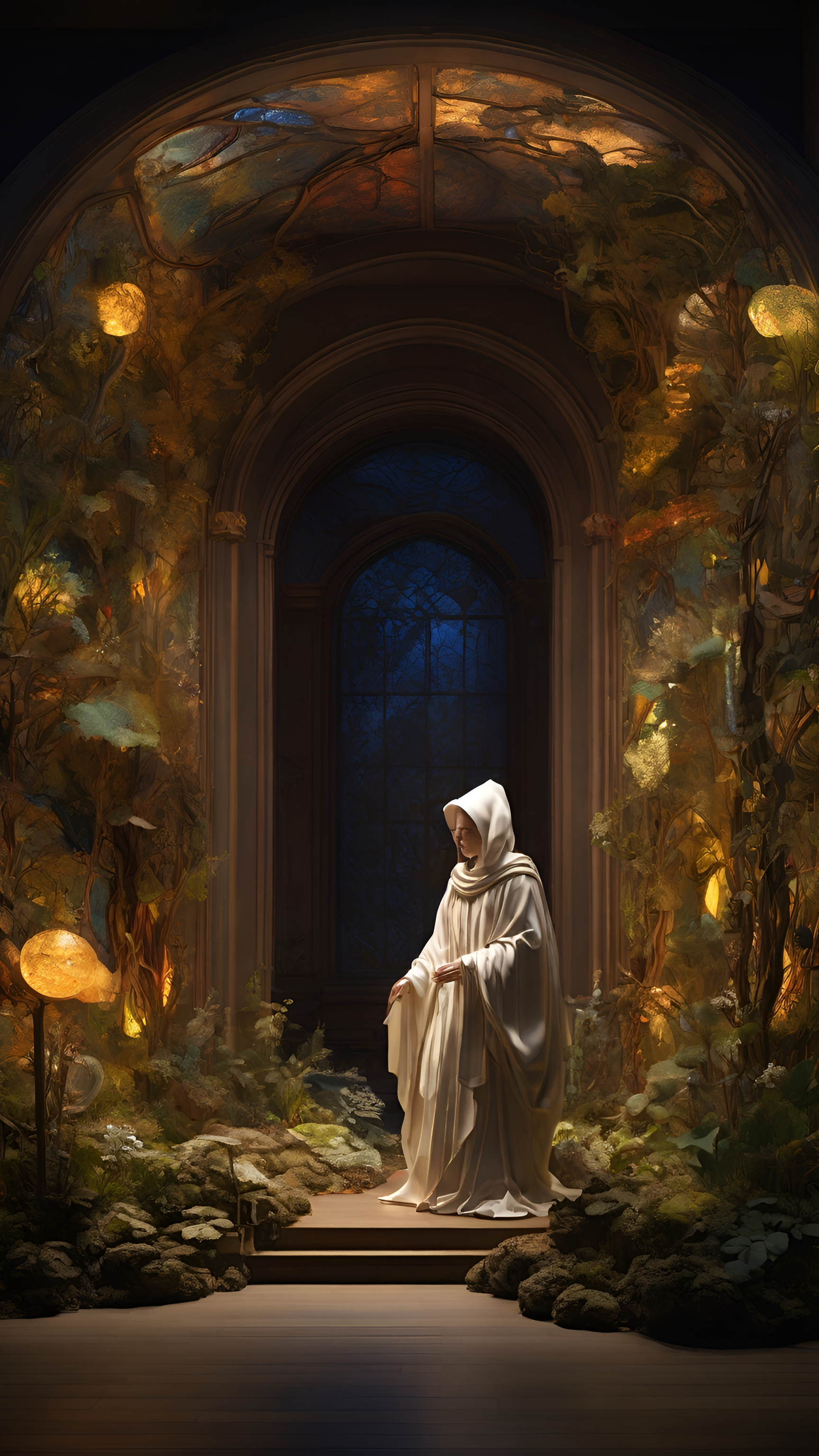Step into a realm of magic and mystery with this stunning wallpaper showcasing a cloaked figure in a softly lit library surrounded by lush foliage and glowing orbs. The intricate details of the environment, illuminated by warm hues, create a captivating atmosphere that invites viewers to explore the secrets hidden within this enchanting space. The vibrant colors of the plants and the ethereal glow of the orbs enhance the dreamlike quality of the scene, making it perfect for fans of fantasy and surreal art. Transform your digital device with this mesmerizing wallpaper that sparks the imagination and inspires wonder.