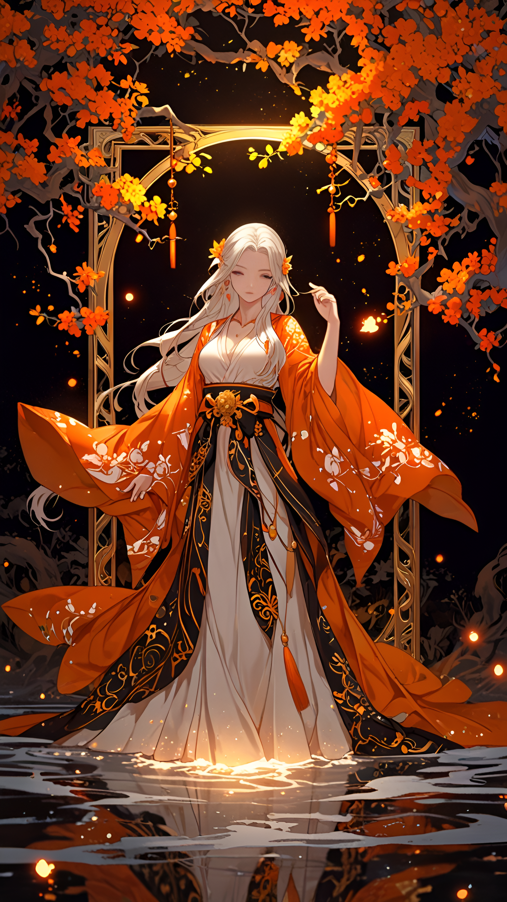 Step into a world of tranquility with this breathtaking wallpaper featuring a figure dressed in an exquisite orange and black kimono, standing gracefully amidst a backdrop of vibrant orange flowers. The serene water reflects the beauty of the figure and the surrounding flora, creating a captivating scene that evokes a sense of peace and harmony. With intricate details and a mystical ambiance, this artwork is perfect for fans of fantasy, cultural art, and serene landscapes. Ideal for personal devices, this wallpaper brings a touch of elegance and calm to your digital environment.