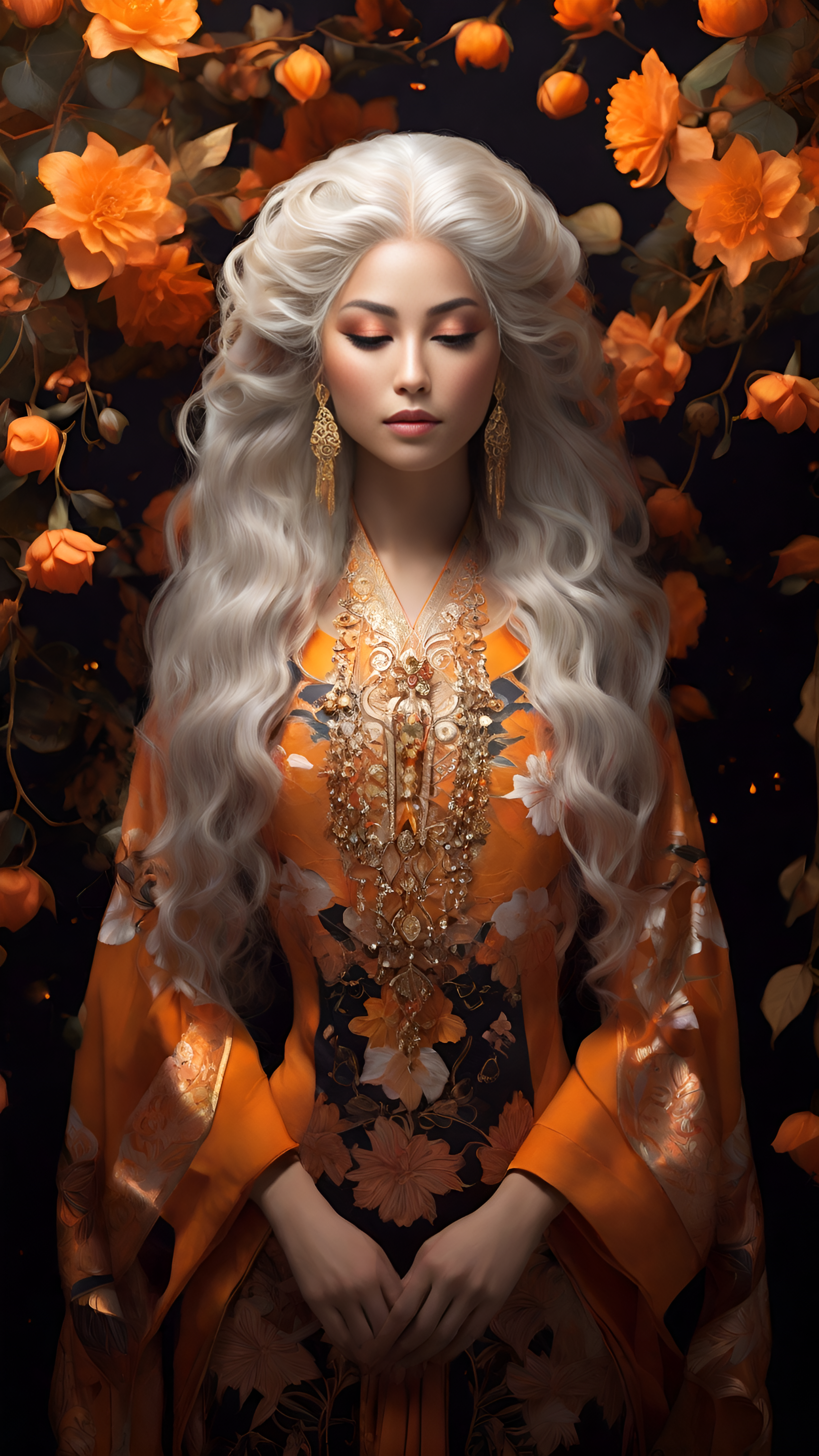 Discover the enchanting allure of this stunning wallpaper featuring a figure adorned in an intricately designed orange and black outfit, complemented by long, flowing white hair. Surrounded by a cascade of vibrant orange flowers, this artwork exudes a sense of mystique and elegance. The detailed embellishments on the garment add a touch of sophistication, making this image perfect for fans of fantasy and artistic beauty. Ideal for personal devices, this wallpaper will transform your digital space into a realm of elegance and inspiration.