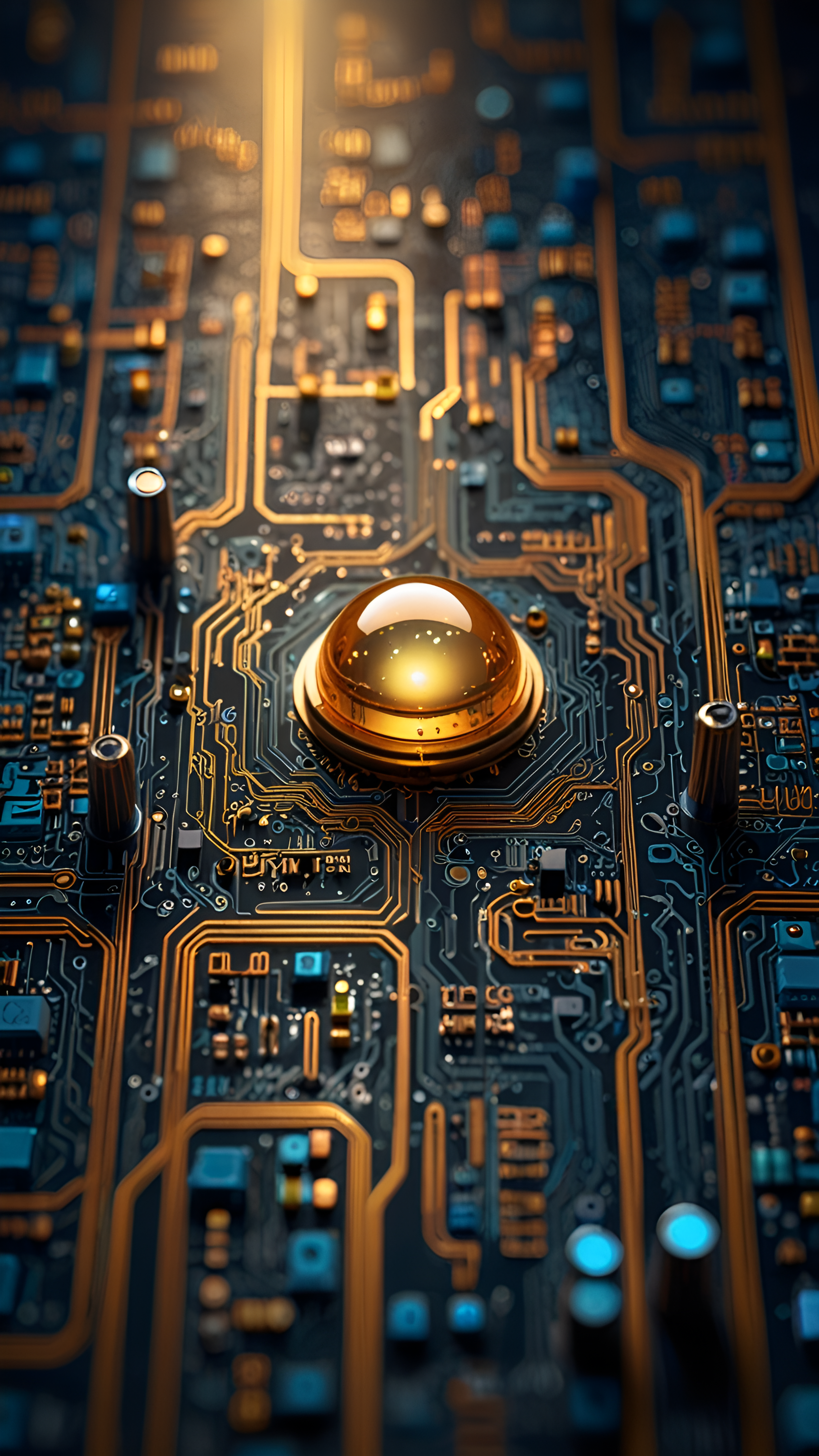 Step into the realm of advanced technology with this stunning close-up wallpaper of a circuit board, featuring a luminous orb at its center. The intricate details of the circuitry, highlighted by vibrant gold and blue components, create a mesmerizing visual that embodies the essence of modern electronics. This artwork is perfect for tech enthusiasts and anyone who appreciates the beauty of digital design. Ideal for desktops, laptops, tablets, and smartphones, this wallpaper brings a futuristic flair to your digital devices and showcases the elegance of technological innovation.
