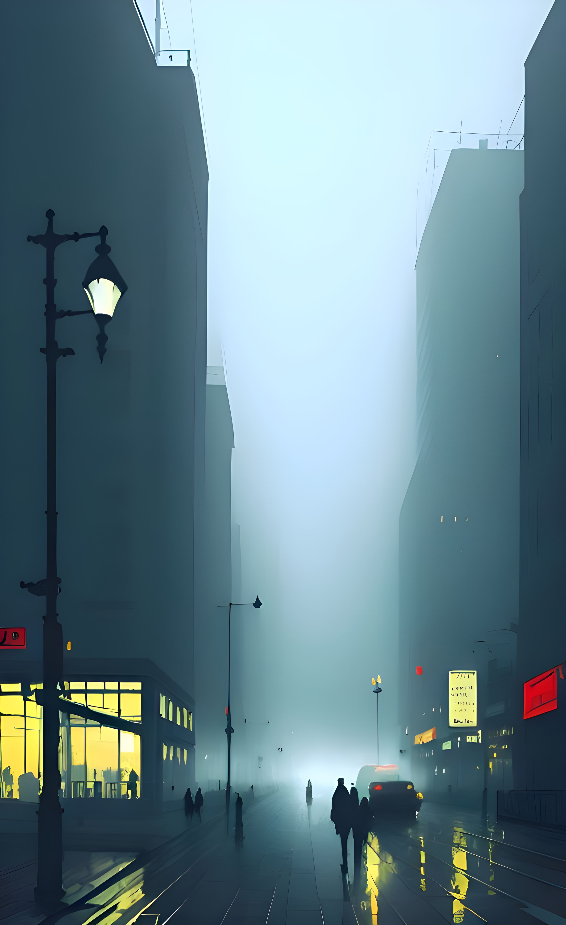 Immerse yourself in the serene beauty of this foggy city street wallpaper, where silhouettes of pedestrians navigate the tranquil urban landscape. The soft glow of storefront lights pierces through the mist, creating a captivating contrast that evokes a sense of mystery and calm. This atmospheric scene captures the essence of city life shrouded in fog, making it perfect for those who appreciate urban aesthetics and moody environments. Ideal for desktops, laptops, tablets, and smartphones, this wallpaper adds a touch of sophistication and intrigue to your digital devices.
