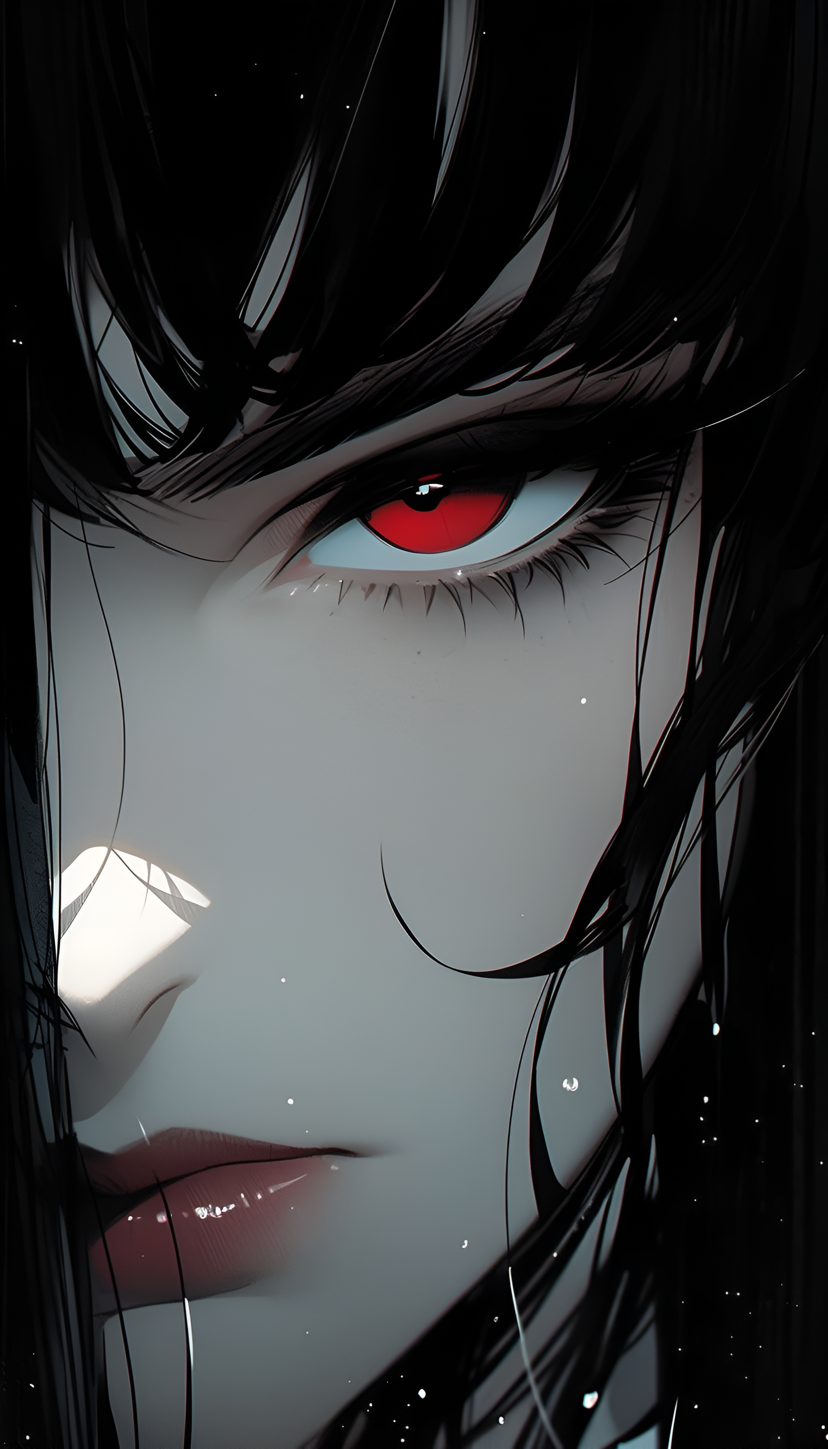 Discover the allure of mystery with this captivating wallpaper featuring a close-up of a girl with mesmerizing red eyes and flowing dark hair. The intense gaze draws you in, while the subtle play of light and shadow enhances the ethereal quality of her expression. The minimalist background accentuates her striking features, creating a dramatic and impactful visual. Ideal for fans of anime and fantasy art, this wallpaper adds a touch of intrigue and elegance to your digital devices, making it perfect for desktops, tablets, and smartphones.